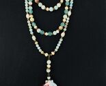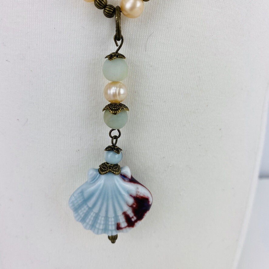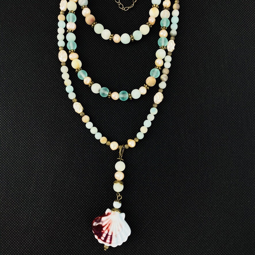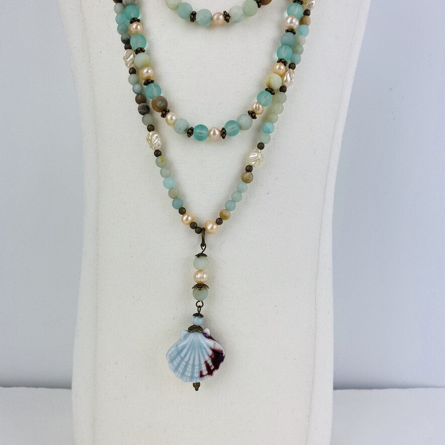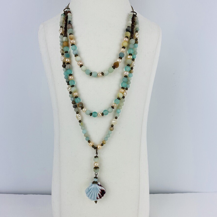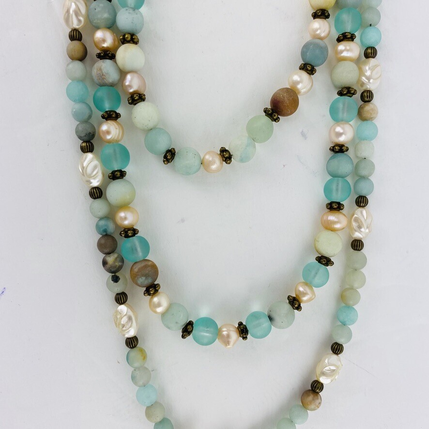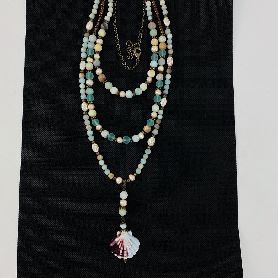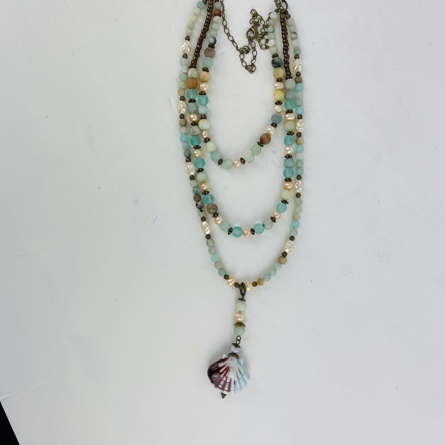 - Boho Earth Tone Amazonite Matte Multi Strand Necklace Antique Gold Tone Shell