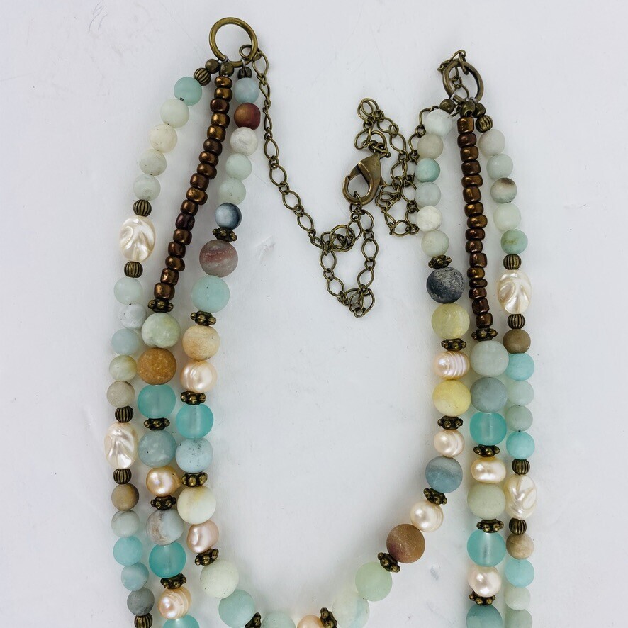Boho Style Earth Tone Amazonite Matte Multi Strand Necklace Antique Gold Tone