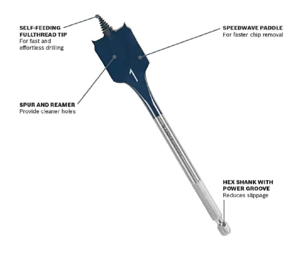 Daredevil spade bits are designed for professional users seeking speed, ease of use and hole quality. A full-cone threaded tip pulls the bit through the material with less effort and vibration than other spade bits. The contoured paddle delivers faster chip removal; hex shank with power groove reduces slippage. Up to 10X faster than conventional spade bits.