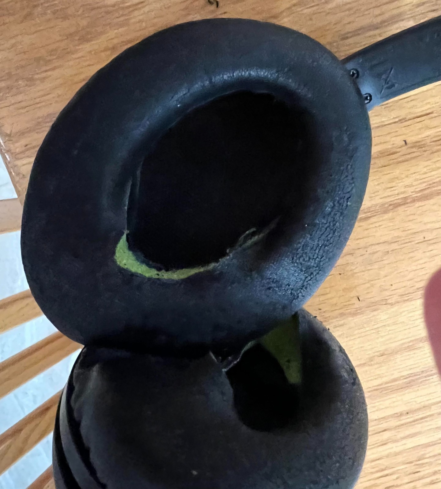 Bose QuietComfort 15 are Ear-Cup (Over the Ear) Headband headphones that deliver great listening experience. The frequency range covered by the model is 3 Hz - 80 kHz. With 73 ohms impedance level and 101 dB sensitivity, this pair of black/silver headphones produces authentic sound. In addition, the wired model weighs 7.1 oz. The outer material for the ear cups is starting to fray. This does not prevent use of the headphones.