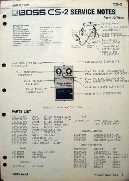 Roland / Boss service manual for the Boss CS2 Compression / Sustainer Effects Pedal in very good condition. Printed in Japan, from 1982.