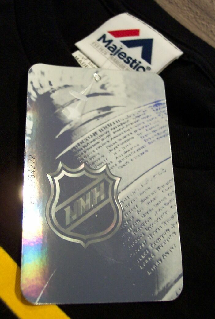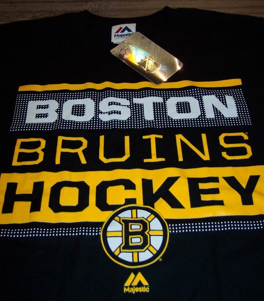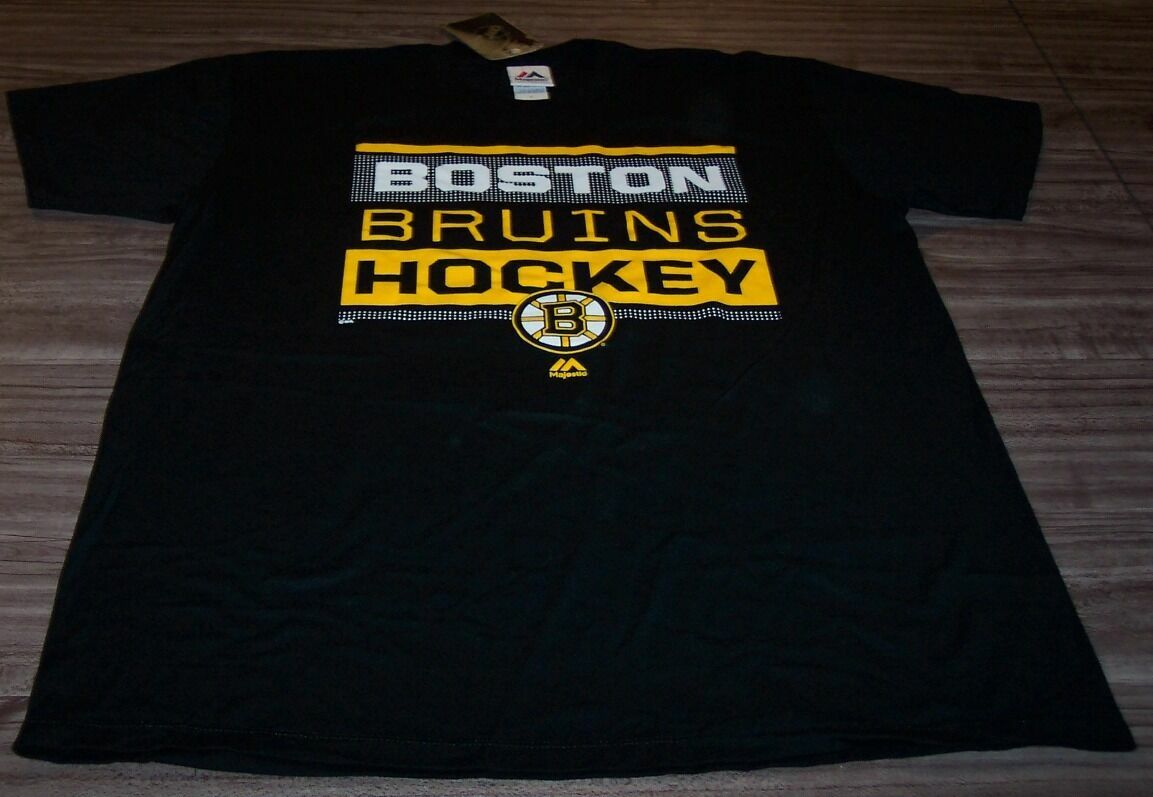 This is a BOSTON BRUINS NHL HOCKEY T-shirt. It is a size XL and is NEW with the tag. It is 23 1/2 inches from armpit to armpit and 31 inches in length. It is an official MAJESTIC Shirt. Combine auctions to save on shipping. AG