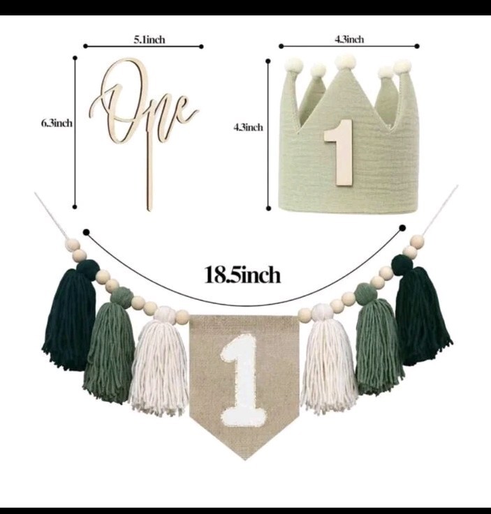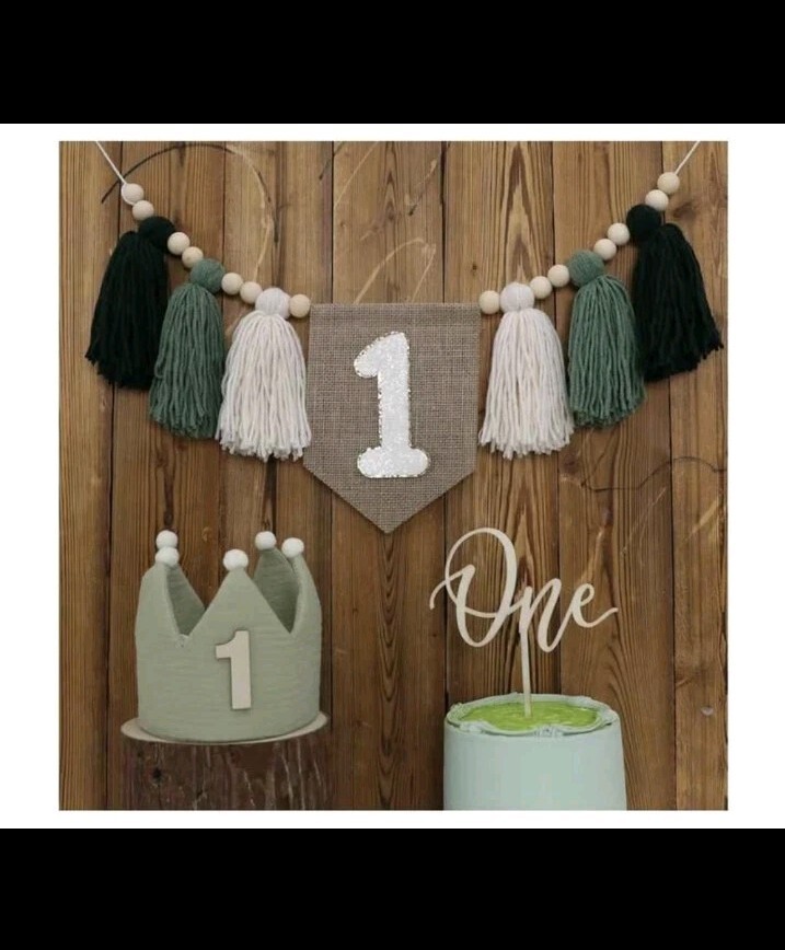 This is an adorable boys first birthday decoration package. Comes with the beads and tassel banner. Super soft padded crown with the number one on it and a cake topper. Everything is brand new in the package