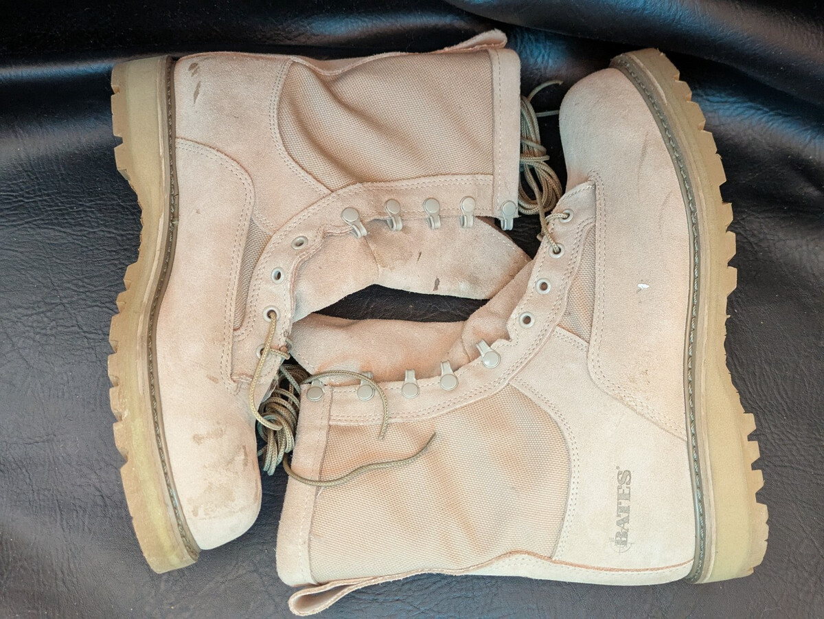 Les bottes de combat militaires tactiques Bates Goretex Dessert Brown en taille 11,5 avec fermeture a lacets sont concues pour les hommes. Ces bottes marron uni sont dotees d'une tige en daim, d'une construction Goretex impermeable et d'une semelle exterieure en caoutchouc durable avec des semelles Vibram. Ils offrent confort et traction antiderapante, ce qui les rend adaptes a diverses activites de plein air et professions militaires, policieres ou de lutte contre les incendies.