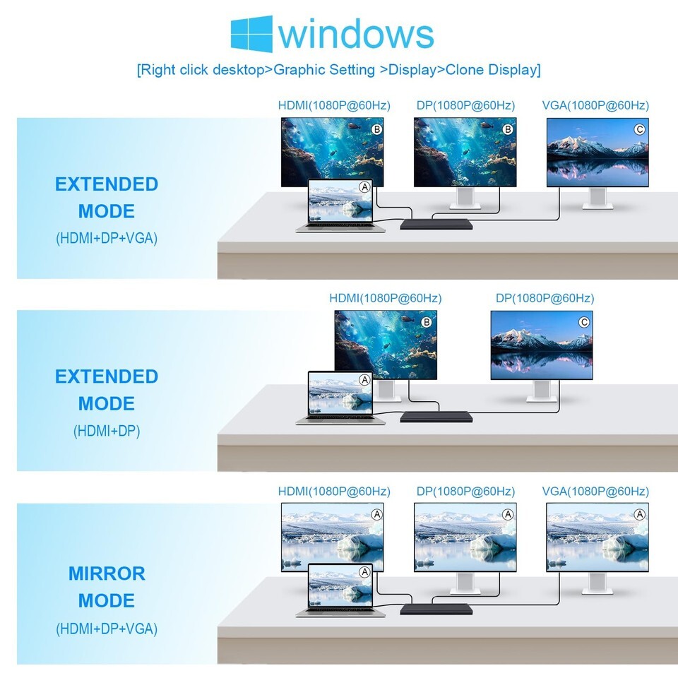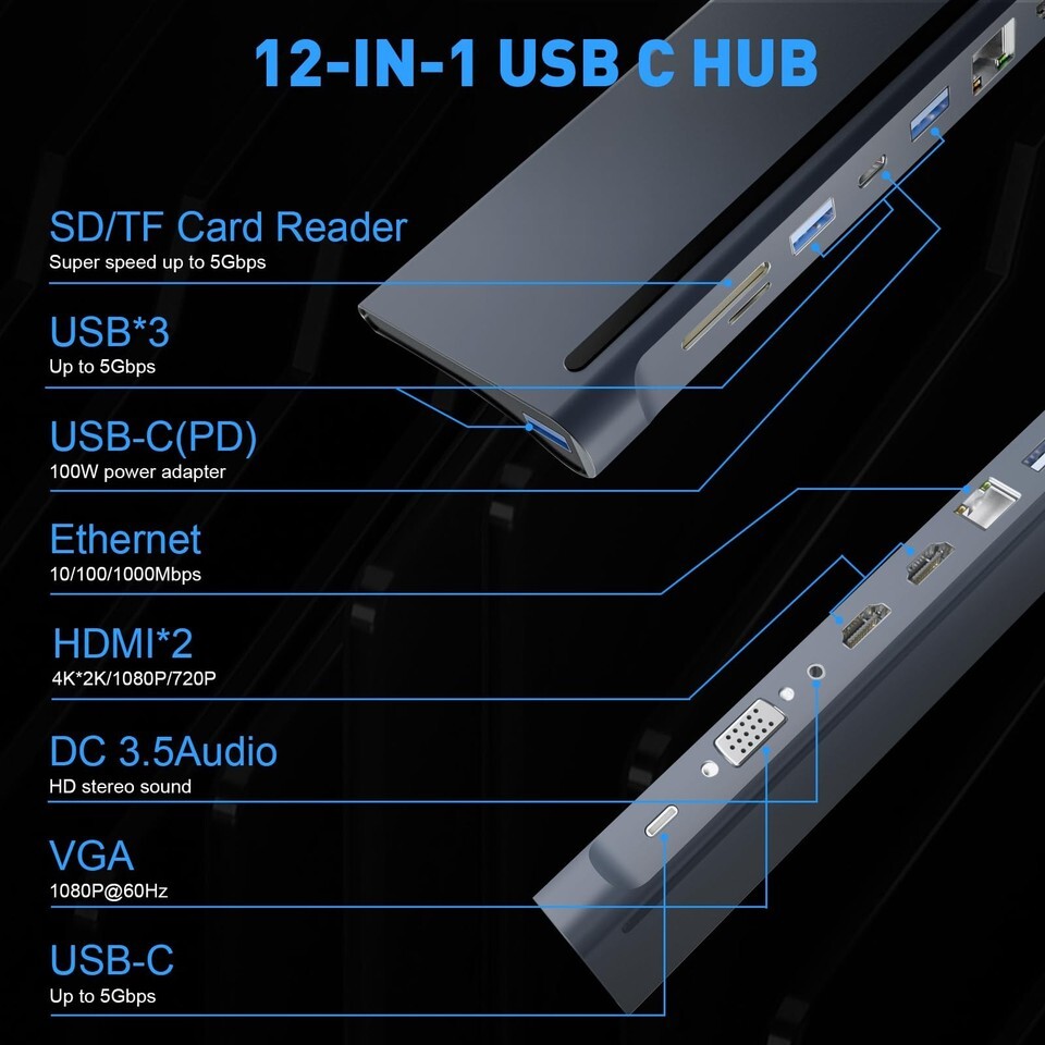 12 IN 1 Universal Docking StationPlug and play.BOVONO Laptop Docking Station with 2 HDMI,1 VGA,2 USB,1 USB 2.0, 1 USB C, RJ45 Gigabit internet, 3.5 mm Audio/Mic, SD and TF ports,1x USB-C (Charge only). This computer dock expands your workstation to improve efficiency while working at home or office.