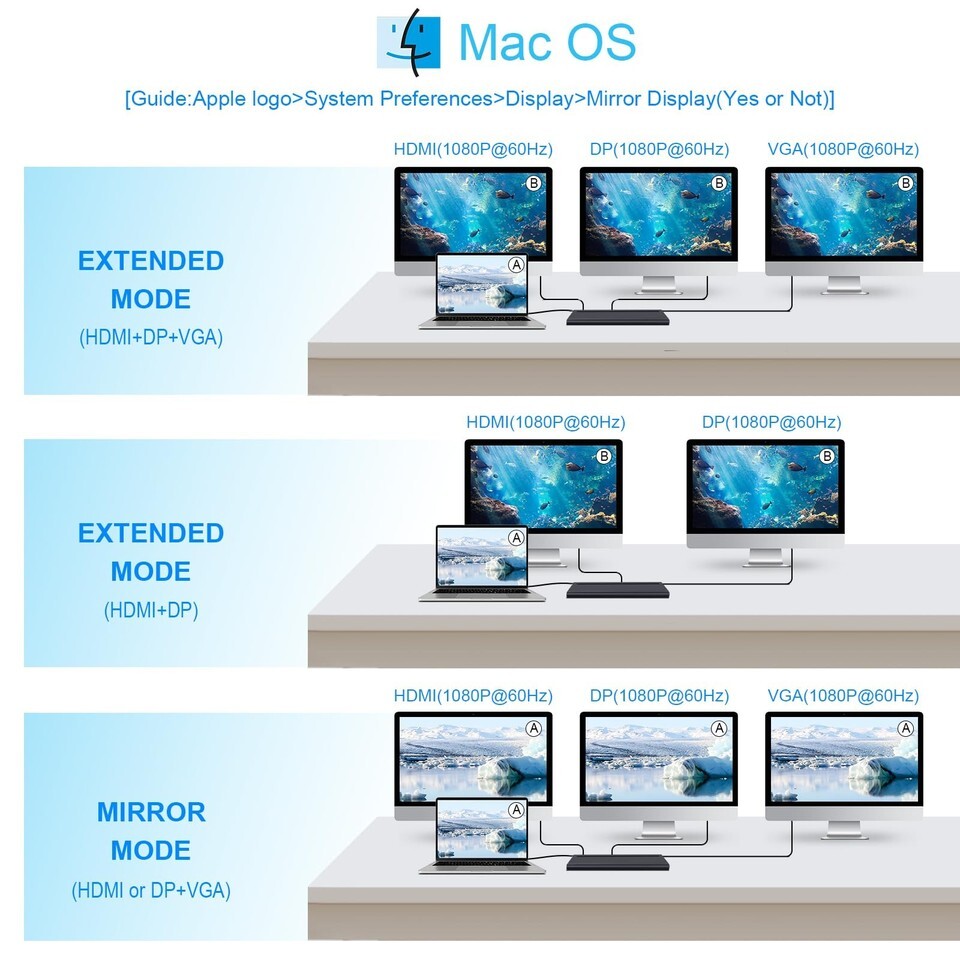 Up to 4K HD Resolution and Triple Display This USB C Hub for laptops supports UHD 3840x2160 (4K) @ 30~60Hz display with your 4k monitor, TV or projector when only using HDMI ports. While using HDMI and VGA ports to triple display , the Resolution is 1920X1080(1080). Note: 1) Mac OS doesn't support Triple distinct display. 2) Up to 4K@30Hz when dual monitors in extended mode.