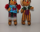 This product consists of two handmade cloth dolls, one boy and one girl, approximately 10" tall, featuring traditional Mexican folk art design. The dolls are crafted in Mexico and come with distinctive pigpompoms and Sumbaro, adding to their charm and authenticity. Perfect for collectors or those interested in Latin American cultures, these dolls showcase the rich tradition and craftsmanship of Mexican artistry. Good condition with normal wear and sizes are approximate.