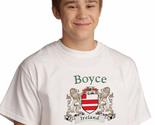 Product description: Boyce Irish Coat of Arms Tee Shirt in White. Every Irish family has a story to tell, probably hundreds of stories. Your Irish coat of arms is a visual record of your family's oldest, most significant stories. Here, they're told in bright, permanent artwork on these fine-quality, 100% cotton Gildan tee shirts. Over 25 years of heraldry research and over 1000 available Irish family coat of arms.