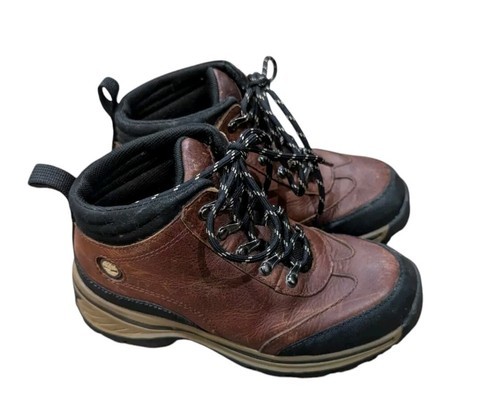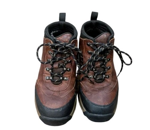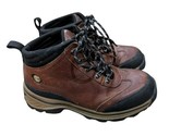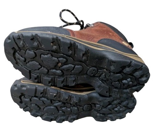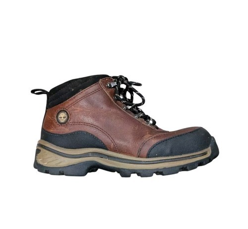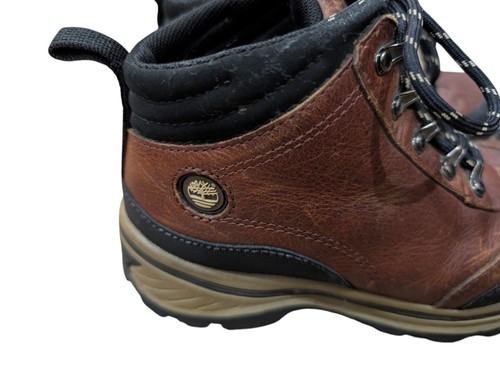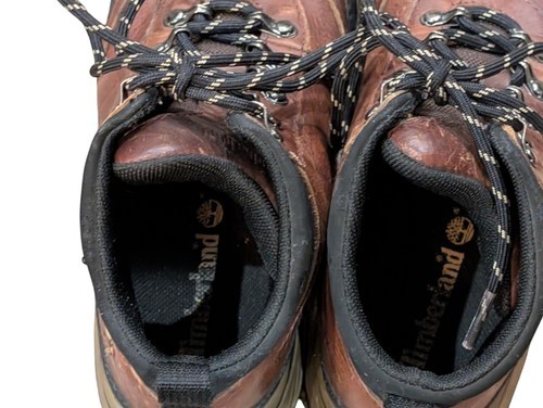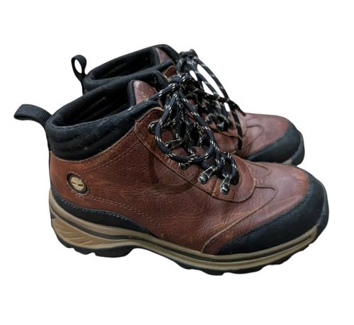 These are boys Timberland brown leather work boots/hiking boots. Brown leather upper with black accents. Size 13.5 youth. They are used but still in very good condition!