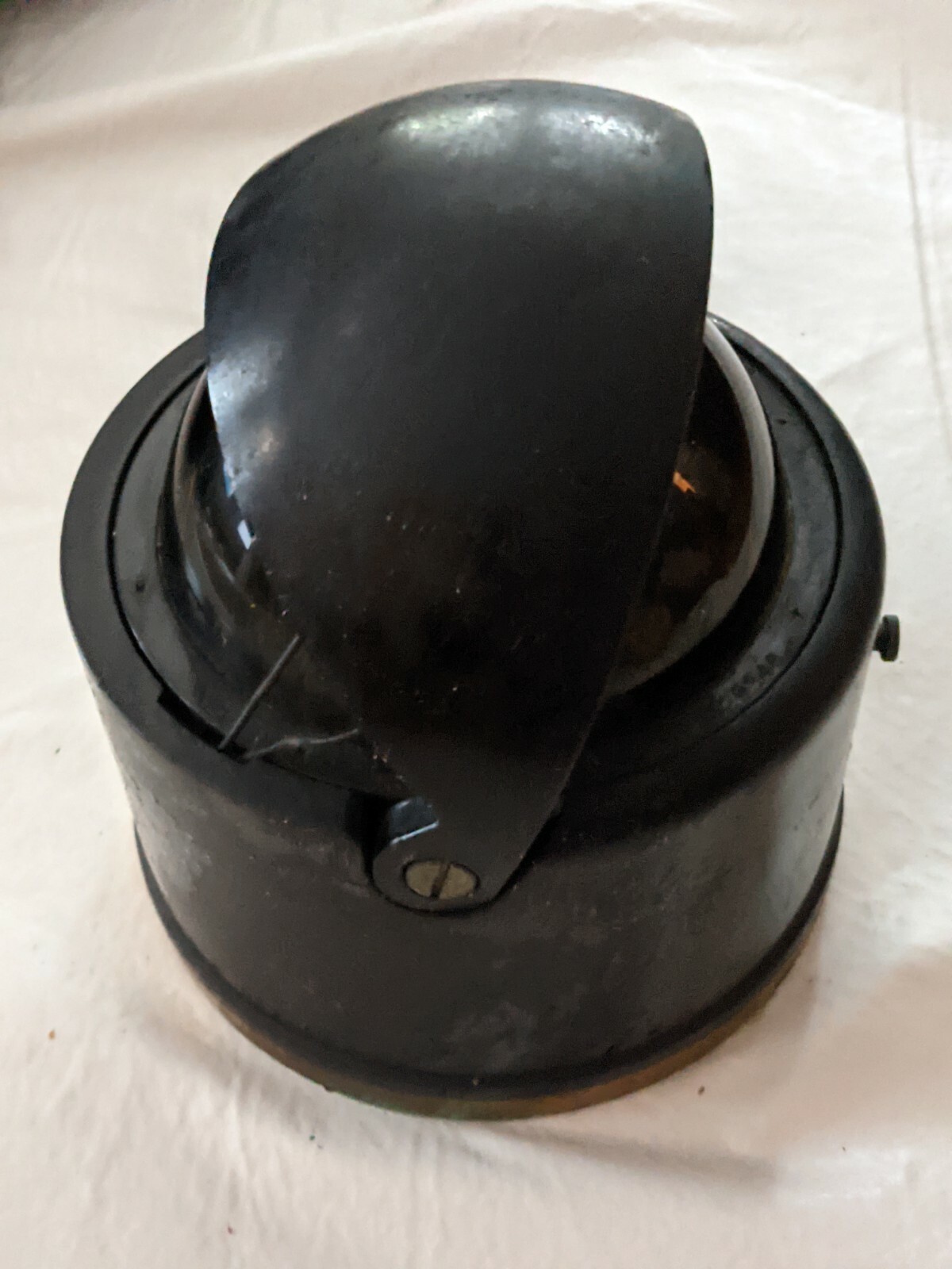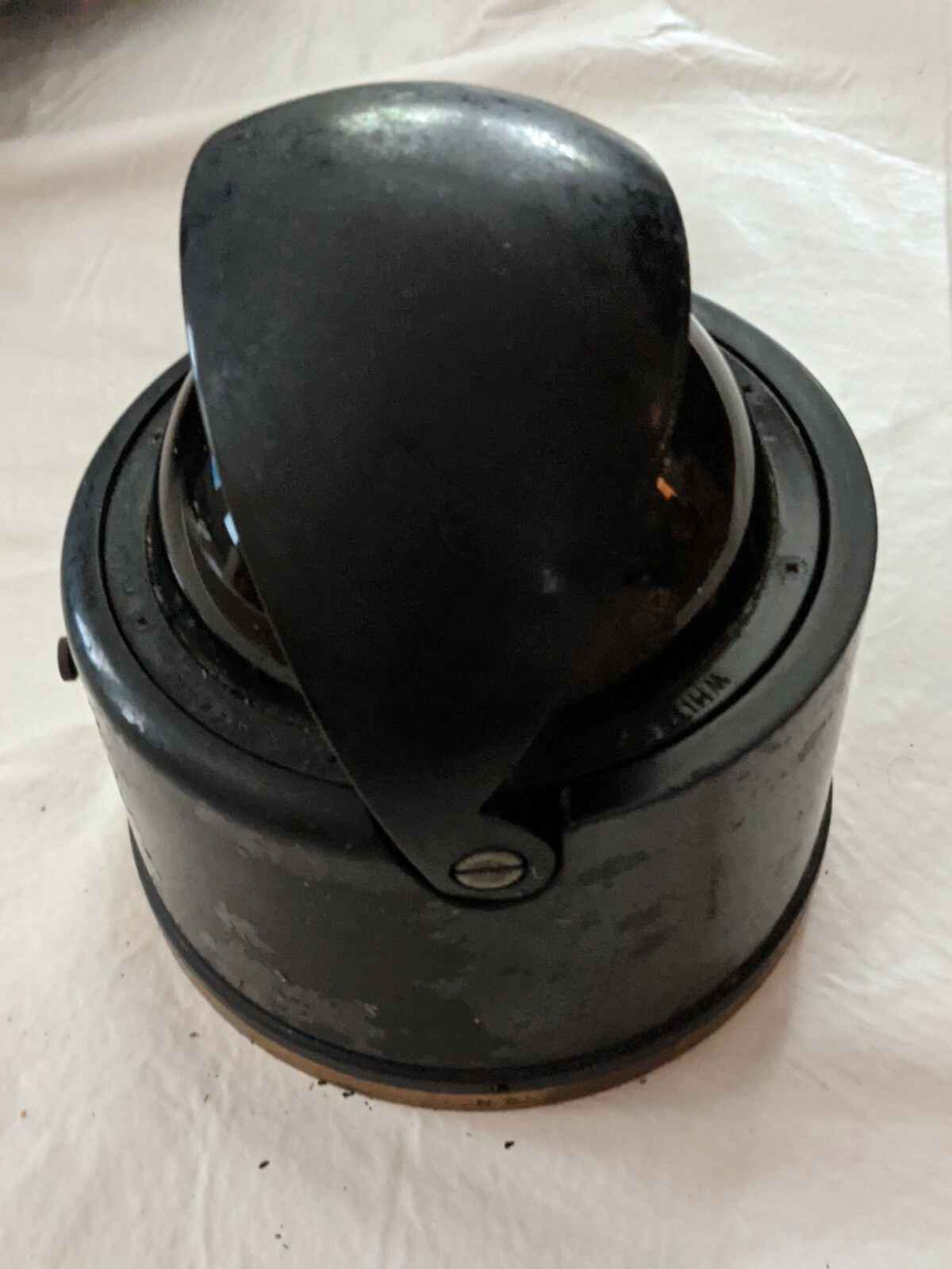 El fabricante indicado en el dial dice Wilfrid O. White and Sons, Inc. Nueva York-Boston-Baltimore. Parece que los cables de luz se cortaron justo donde salían de la carcasa cuando se retiro la brújula, pero todos los componentes electricos estan presentes, incluida al menos una bombilla que se puede ver arriba y a traves del vidrio en la carcasa superior. No he probado las luces ya que no soy un experto en brújulas. Parece que la brújula debe liberarse de la carcasa con un tiron en un pasador cargado de resorte en la parte delantera de la carcasa. Tire del pasador y la brújula esta libre de la carcasa, pero cuelga despues de moverse hacia arriba 1/8 ". Supongo que hay algún truco para la eliminacion completa y no estaba dispuesto a forzarlo, así que no continuo mas.