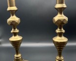 These wonderful candle sticks are about 11? tall and 4? at the base. Vintage brass. In very good condition, but they are used. Push up sticks to remove spent candles.