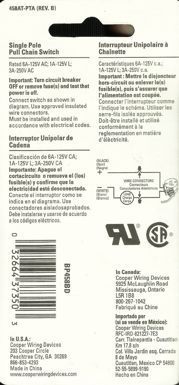 SPECIFICATIONS OF COOPER PULL CHAIN SWITCH MPN 458BD aka BP458BD .....