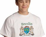 Product description: Breslin Irish Coat of Arms Tee Shirt in White. Every Irish family has a story to tell, probably hundreds of stories. Your Irish coat of arms is a visual record of your family's oldest, most significant stories. Here, they're told in bright, permanent artwork on these fine-quality, 100% cotton Gildan tee shirts. Over 25 years of heraldry research and over 1000 available Irish family coat of arms.