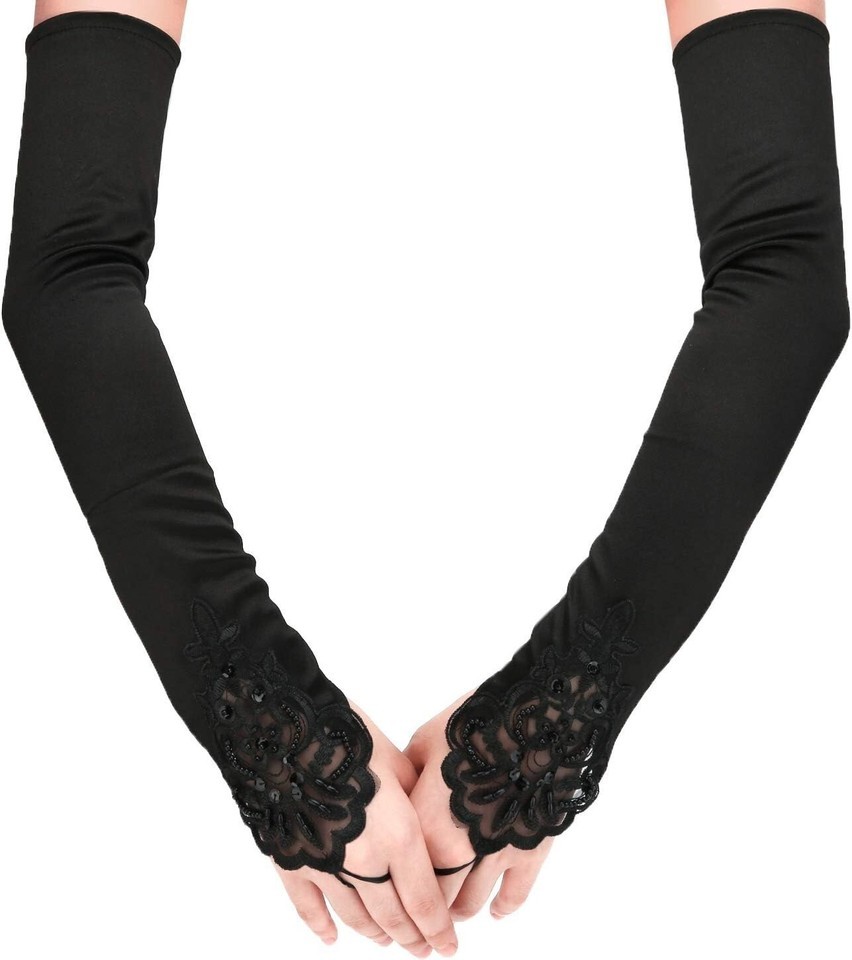 - Bridal Prom Costume Adult Satin Fingerless Gloves Black Opera Length Beaded