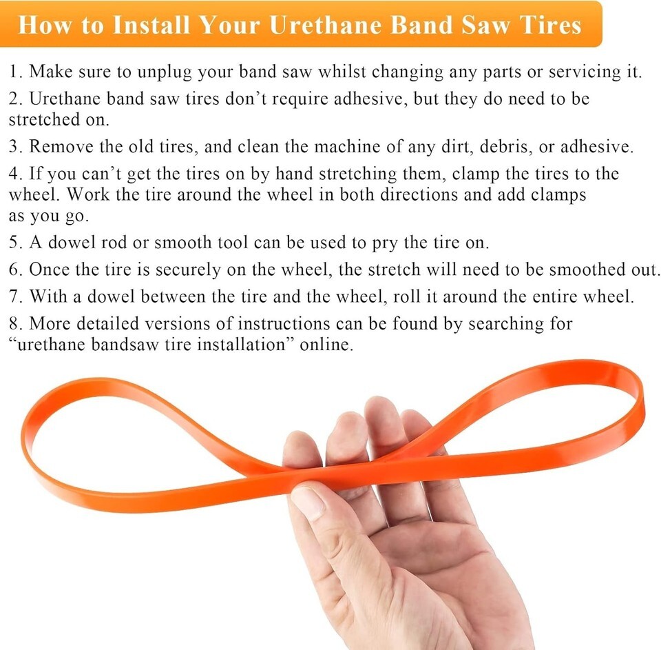 Don't settle for anything less than the best?upgrade your bandsaw today with our Bright Orange Bandsaw Tires and experience the difference in your woodworking projects!