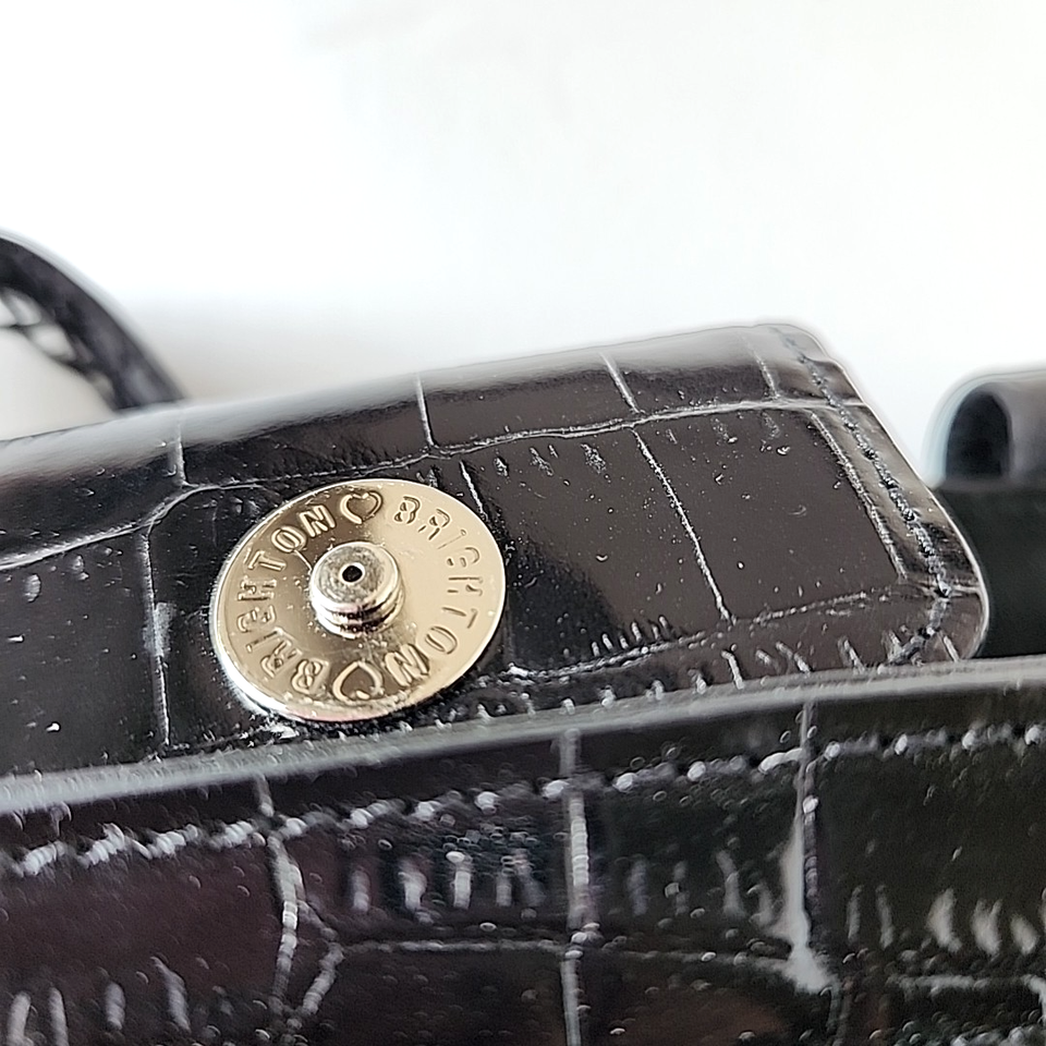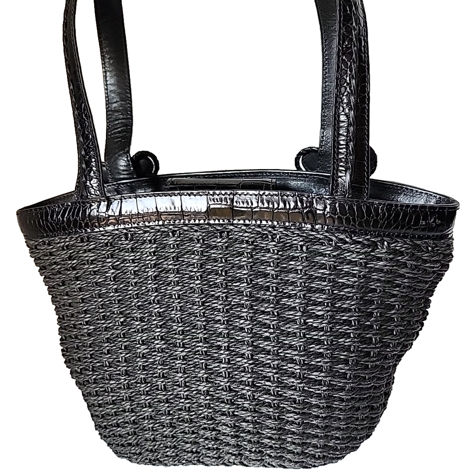 Brighton Twilight Straw Handbag Black Rhinestone Embellished Double Handles Tote Type: Tote Style: Double handle, Rhinestone embellished flower on front, Brand: Brighton Material: Leather handles and trim, Woven straw Color: Black Approximate Measurements: Bag 8" wide, 7" tall, 5" deep. Handle/Strap 9" Condition: Excellent pre-owned condition with no noted flaws. Stock Number: PB015 Please ask any questions you may have. Offers are always encouraged.
