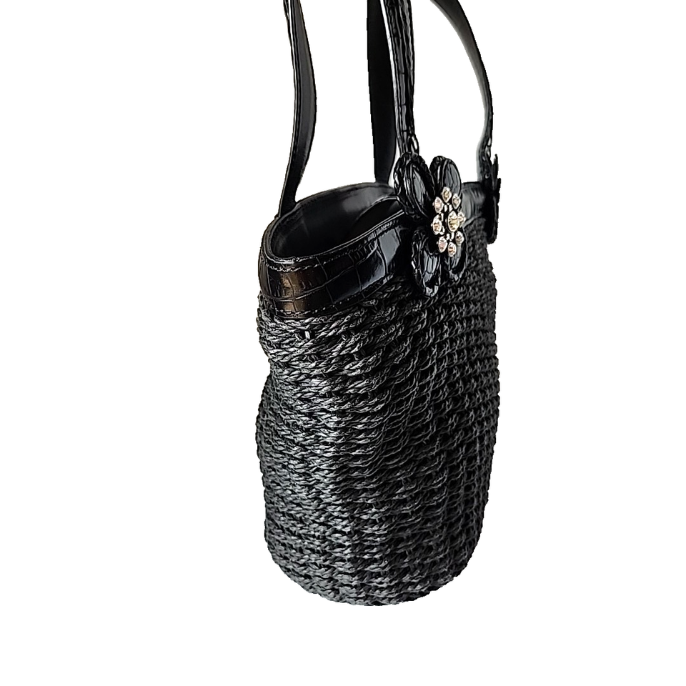 Brighton Twilight Straw Handbag Black Rhinestone Embellished Double Handles Tote
