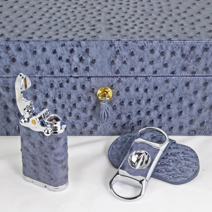 Brizard American Blue Jeans Ostrich Humidor with Table Lighter & V-cutter NIB