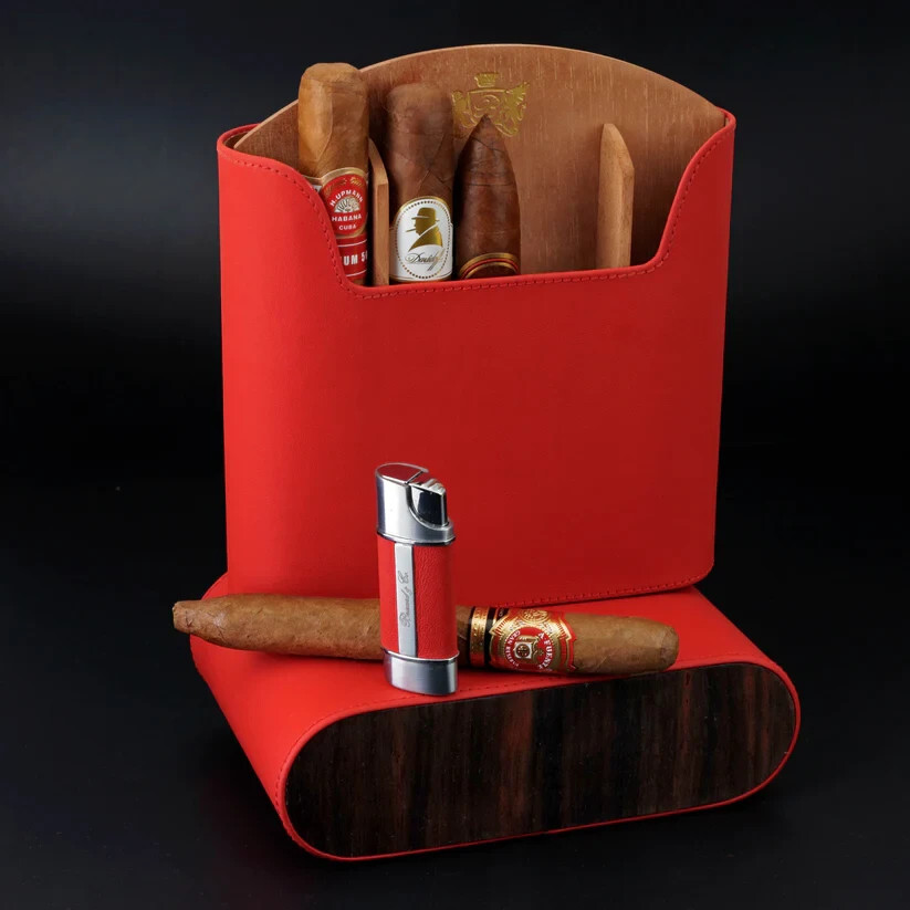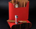 The Brizard "Show Band" 5 case is a premium cigar accessory made in the United States. Handmade with red leather and Macassar ebony, this case exudes elegance and quality. Perfect for cigar enthusiasts looking to store and transport their cigars in style, this case is a must-have collectible for any tobacco lover. Enhance your cigar smoking experience with this luxurious and functional piece. This listing is for cigar case only, lighter in photo not included.