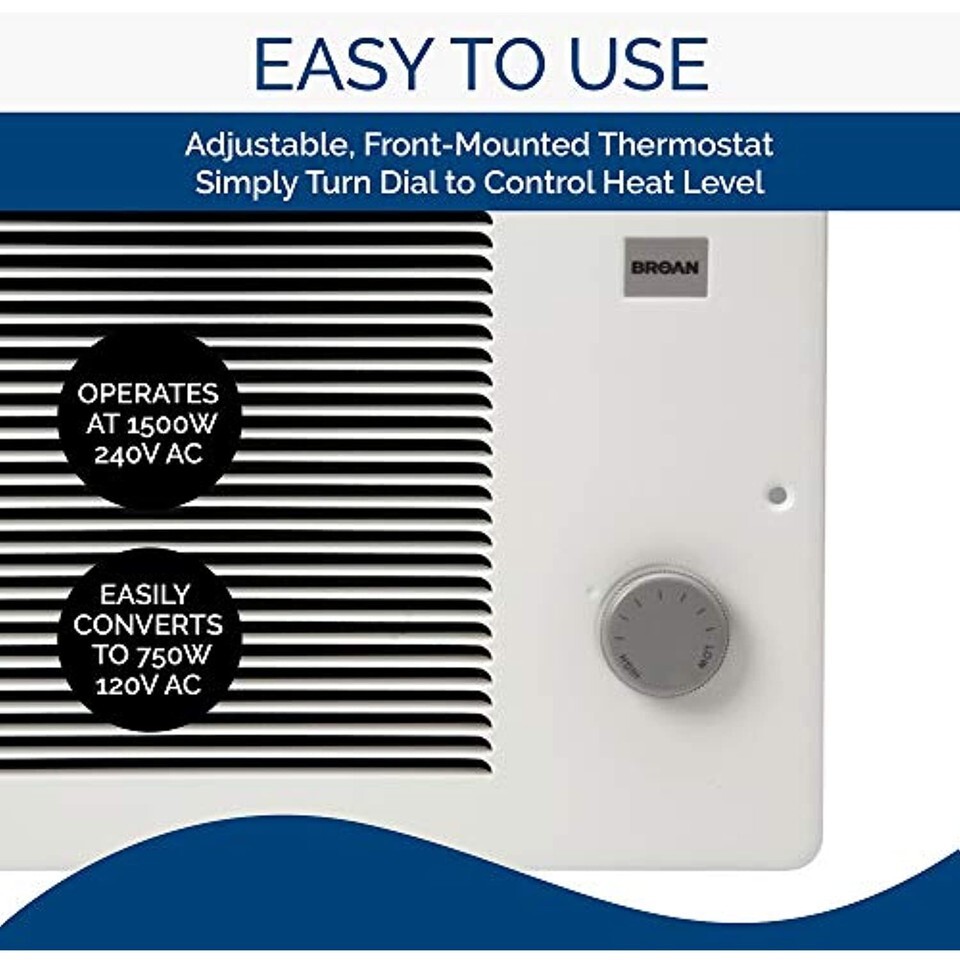 Broan Wall Heater, White Grille Heater with Built-In Adjustable Thermostat, 750/1500W, 120/240V AC