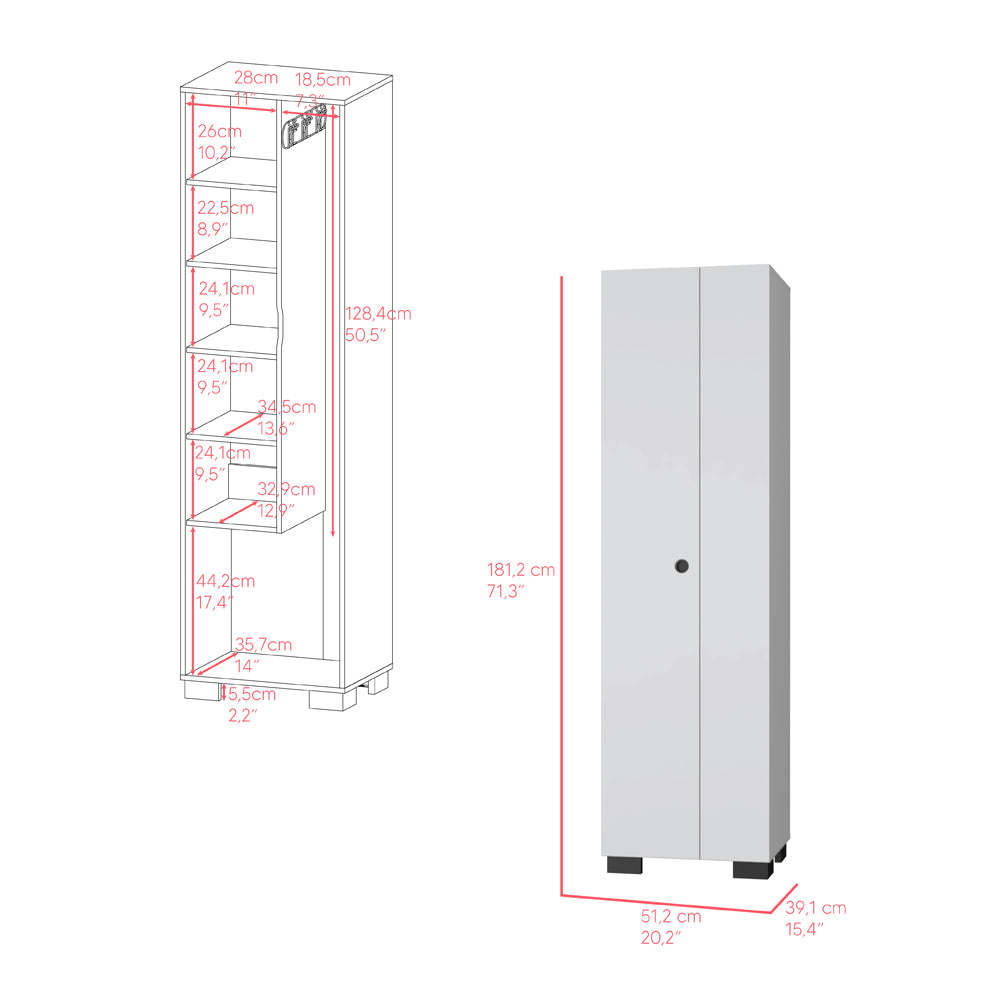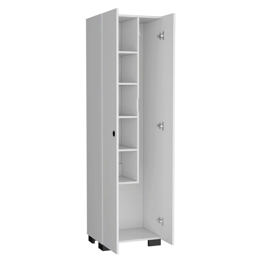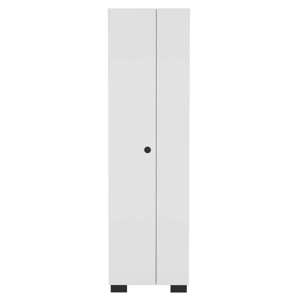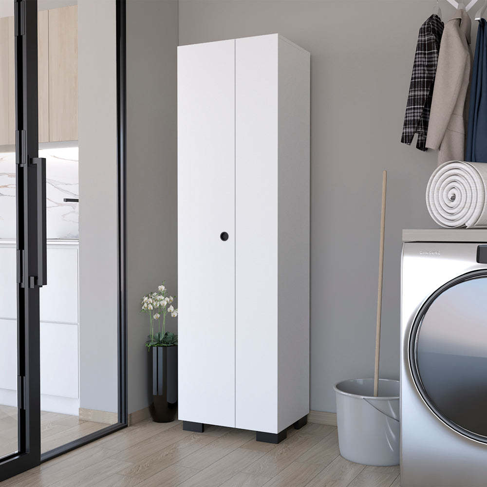 Discover the Broom Cabinet Lucin an embodiment of practical elegance for your storage needs. Tailored with a slim profile, this cabinet effortlessly fits into narrow spaces, ensuring efficient use of your home's footprint. Dual doors open up to reveal roomy storage shelves (9.5"H X 11"W X 13.6"D), perfect for your cleaning supplies and essentials. Three dedicated broom hangers provide quick access on its side, while the base compartment accommodates additional items. Crafted in a pristine white manufactured wood finish.