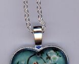 Bubble Heart shaped pendant w/GrBl back of White Cat, Flowers w/ Chain included