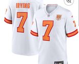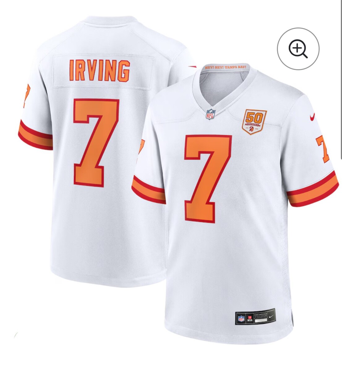The replica jersey of Bucky Irving, the star HB for the Tampa Bay Buccaneers, to commemorate the team's 50th anniversary in 2025. The jersey is in the classic white and orange, representing the regular 76' season color scheme. Designed for men, this NFL fan apparel is perfect for showing support for both the team and player during games or casual wear. This unique and limited edition jersey is a must-have for any Bucs fan looking to celebrate this significant milestone in the team's history.