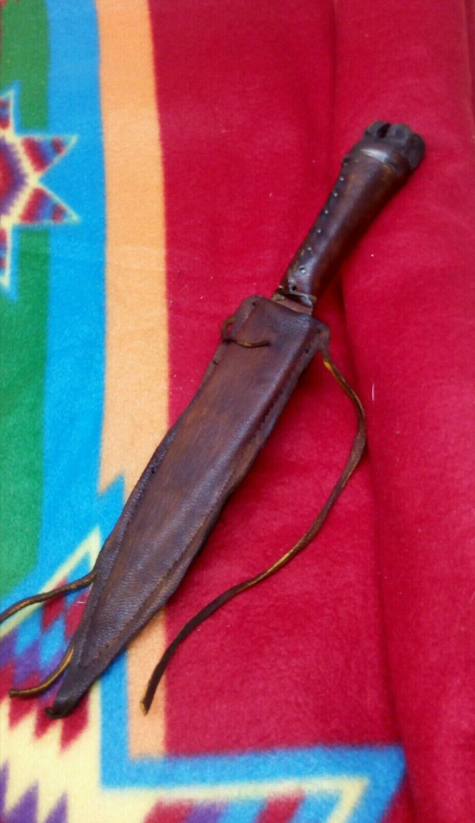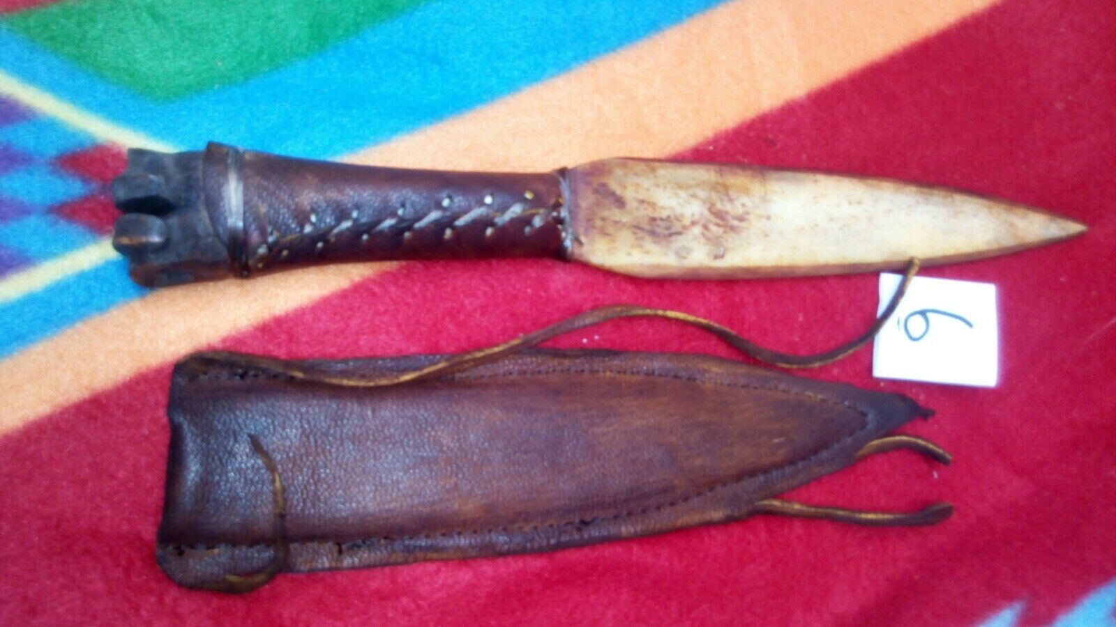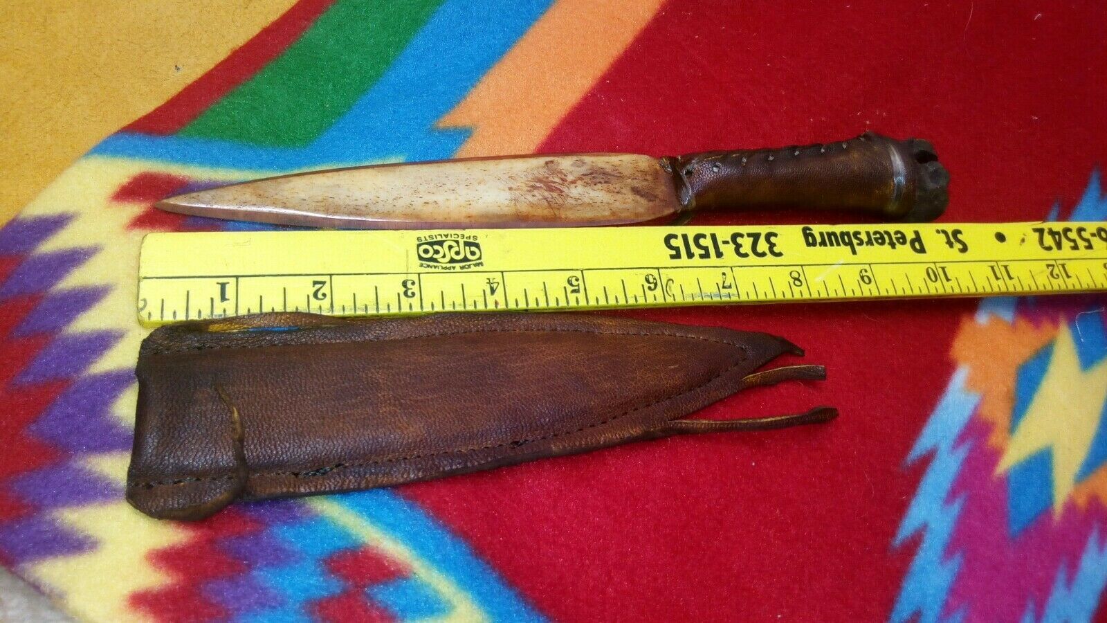 Buffalo Bone knife blade, Deer Leg handle, deer hand stitched buckskin leather wrapped in imitation sinew, Knife. with sheath made of latigo and deer buckskin, machine stitched. 13 inches long. Powwow Reenactment Black Powder. Condition is "New". Shipped with USPS First Class.