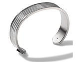 Contemporary stainless steel open cuff bracelet with polished edge.