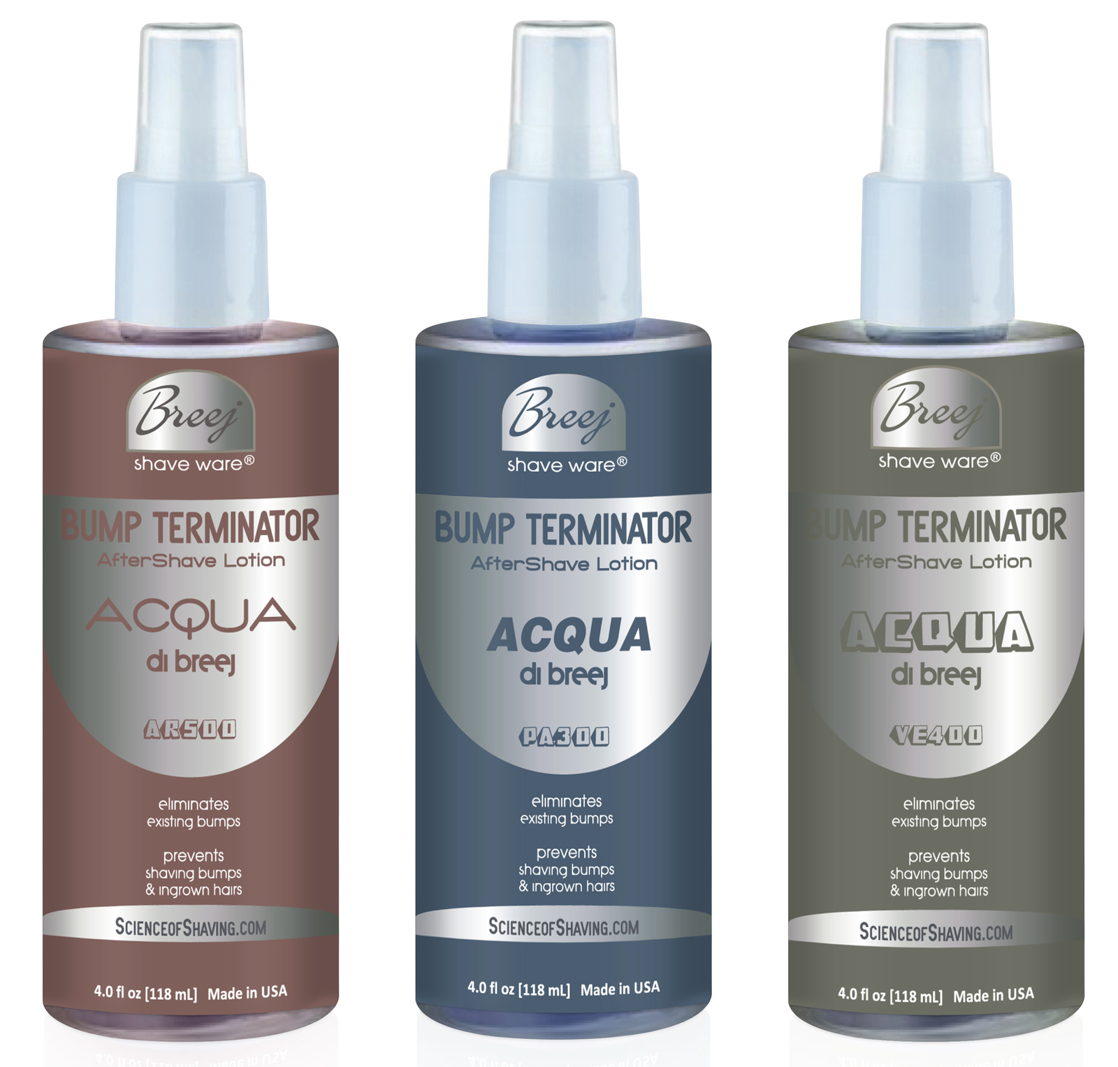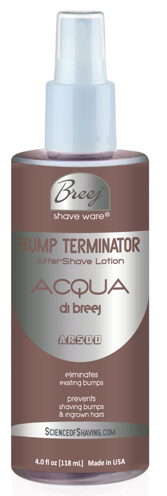 BUMP TERMINATOR Fragranced Anti Bump Aftershave Lotion ACQUA DI BREEJ AR500 Is formulated with A Refined, Spicy, Lavender, Amber Fragrance. This Bold Masculine Scent is a Blend of Bitter Lemon, Sweet Orange, High Altitude Lavender, Sage, Cedar And Tobacco in an anti bump formula based on very effective natural healing oils and extracts plus glycolic acid, salicylic acid and alpha bisabolol.