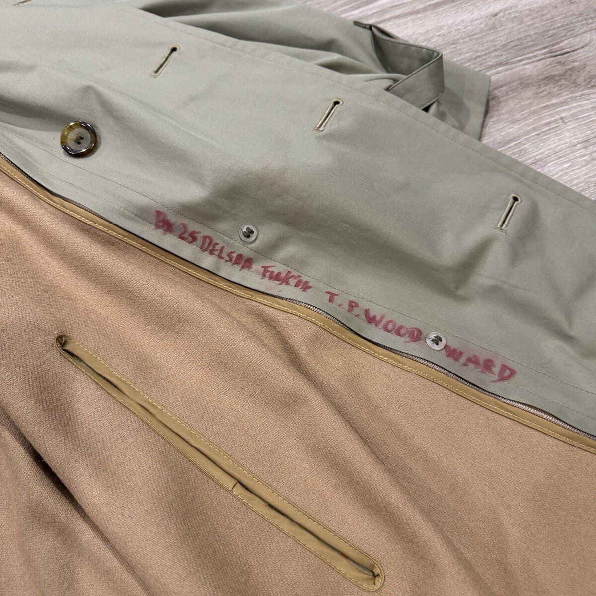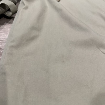 This trench coat has a couple of small spots that are not very noticeable but I do show them up close in the photos. The inside flap of the coat has been personalized with a marker as shown. The liner has a small pin head size hole as shown. It's in overall very good used condition. See pictures for more details.