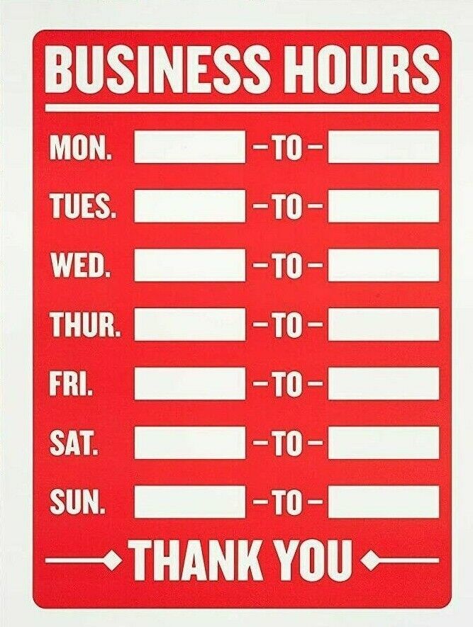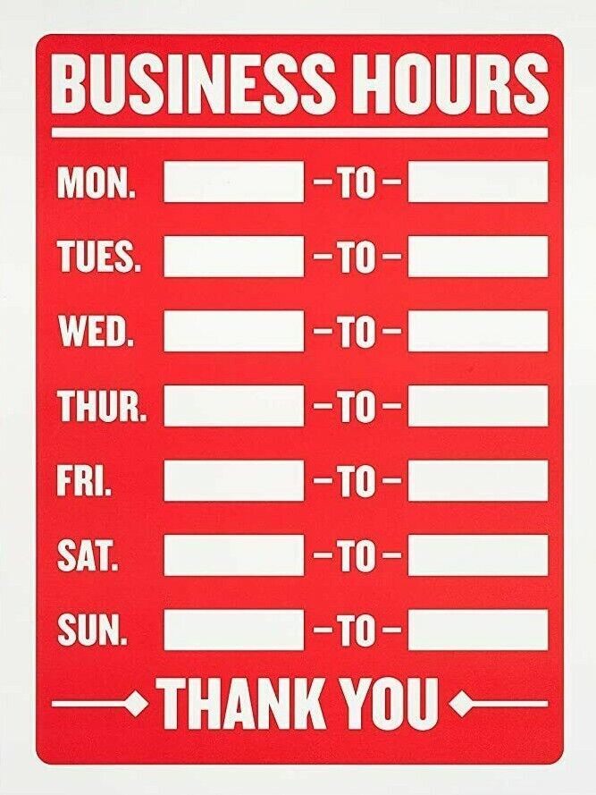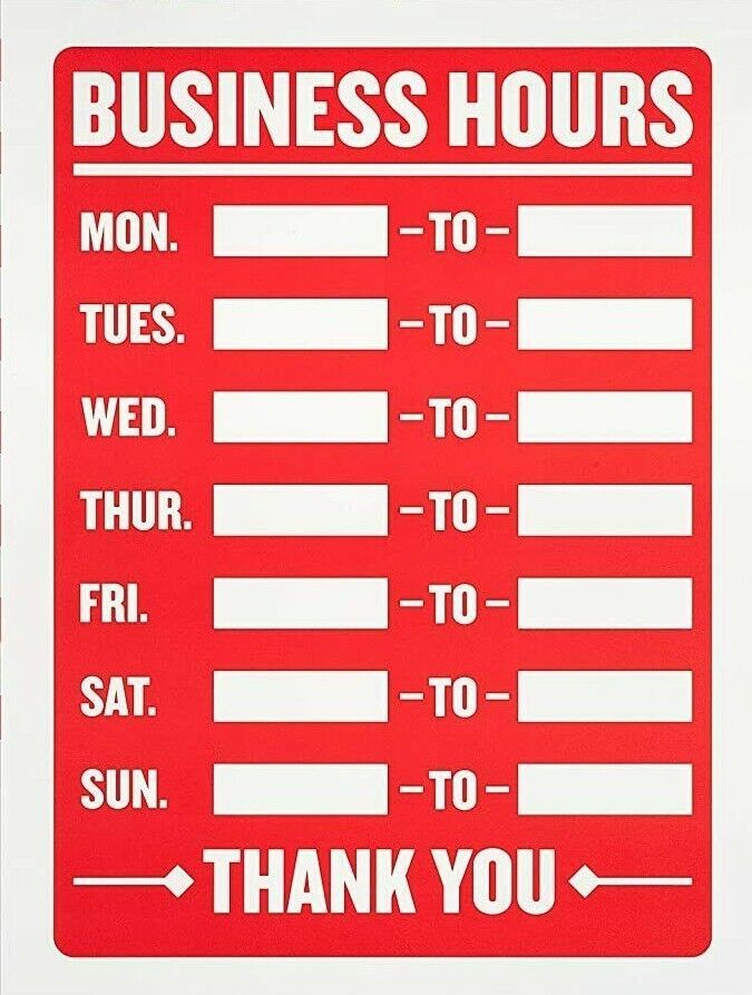 You are Buying a brand New And Factory Sealed Business Hours Sign 8 x 12 Inch - 2 Count, White and Red.