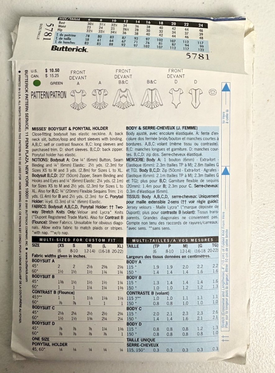 Butterick 5781 Pattern Size XS, S, M Uncut Vintage 2001 Skating Outfits. Although this is a new, Uncut Pattern, there are initials written on the outside of the envelope. UPC #031664284147 - See Photos for further description.