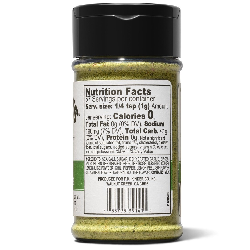 Sea Salt, Cane Sugar, Dehydrated Garlic, Spices, Maltodextrin, Dehydrated Onion, Dextrose, Turmeric (Color), Lemon Juice Powder, Chili Pepper, Lemon Peel, Natural Flavor, Sunflower Oil, Natural Butter Flavor (Butter, Sweet Buttermilk, Natural Flavor)./div