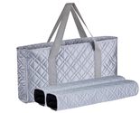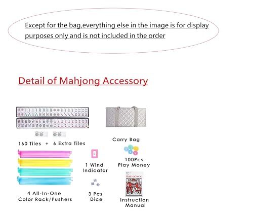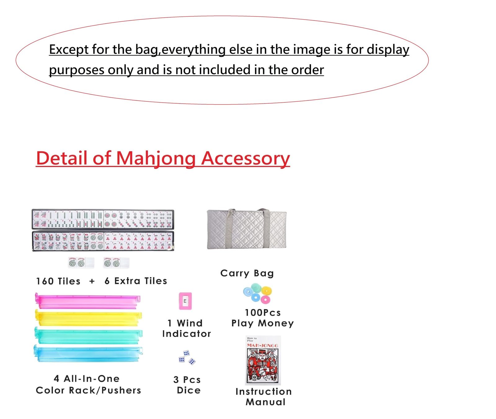 Product description: Introducing our high-quality professional Silver MAH JONGG Bag, complete with two matching wrappers equipped with strap fasteners to safeguard your tile racks and trays. This extra-large bag measures 21.5 inches by 12 inches, providing ample space for all your mahjong essentials. Dirt-resistant and easy to clean, this bag effectively shields your mahjong set and accessories while ensuring convenient portability. Inside the carry bag, you'll find a hidden zippered pocket for storing extras like dice, spare tiles, play money, wind indicators, and more. The items shown in the picture, except for the bag, are for display purposes only and are not included in the order.
