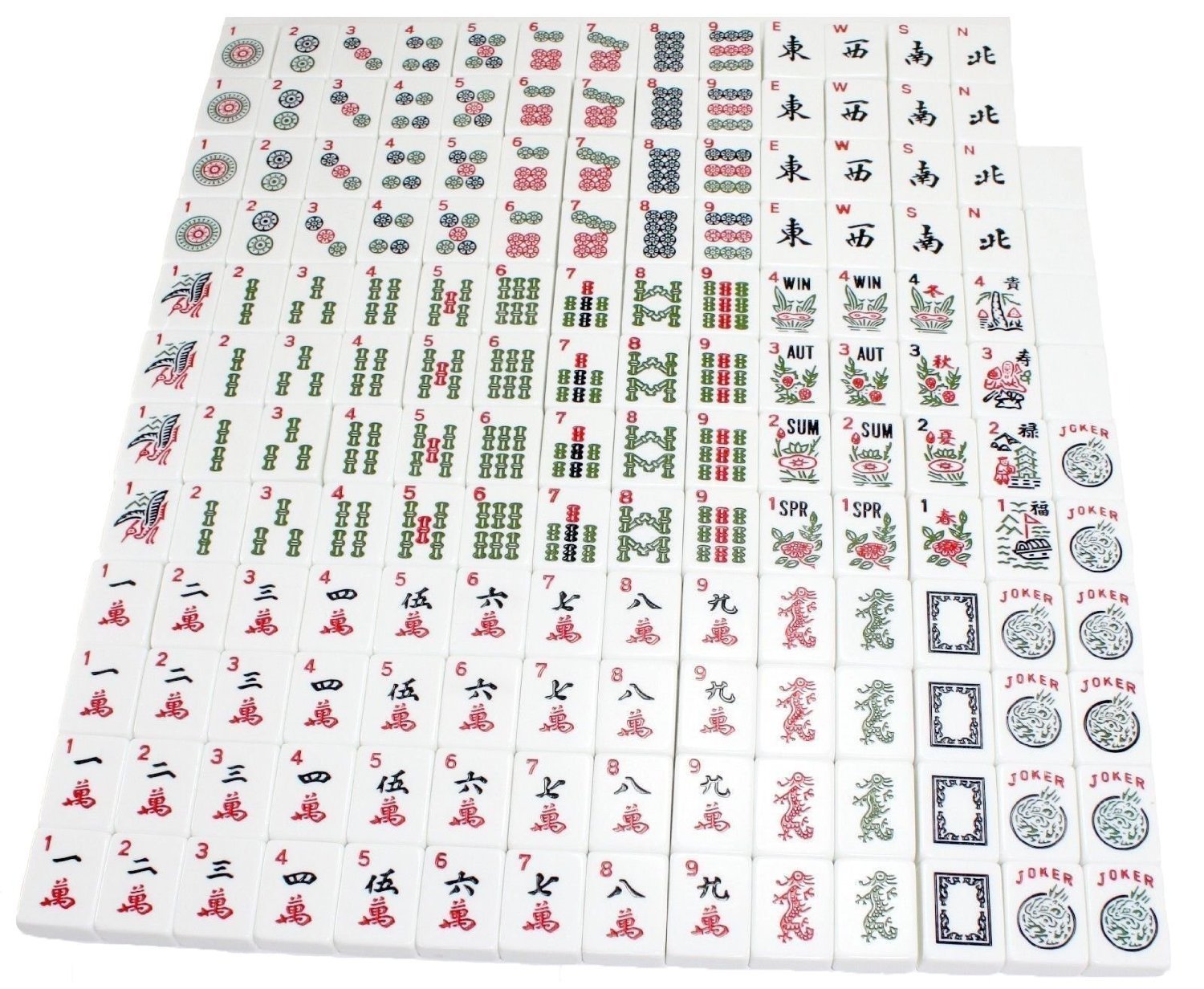 166 tiles. (B Type Set) Tile size (approx.): 1.3x 0.9 x0.6. - 36 Circles - 36 Bamboos - 36 Characters - 12 Dragons (Red Green and White) - 16 Winds (N, E, S, W) - 16 Flowers - 10 Jokers - 4 Blank Spares. Mah Jong Tiles with 2 Set Trays and Lids.