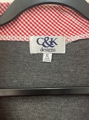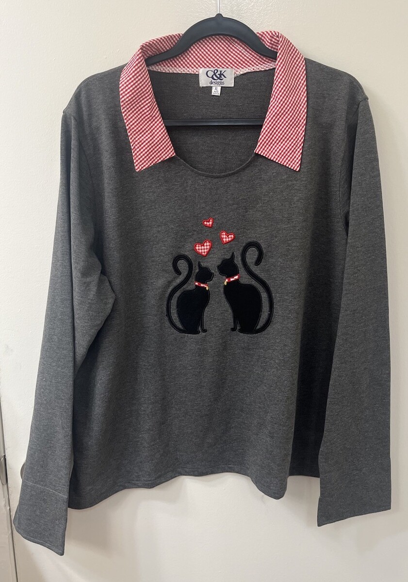 - C&K Designs Cat Heart Sweater Long Sleeve red Gingham Collar Gray SIZE XL