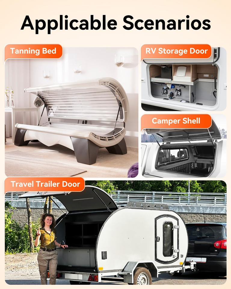 [Usage Scenarios]: 60lb shocks fit well on sunquest tanning bed, tonneau cover, boat engine cover, rv queen bed, basement compartment door, cargo door, truck topper camper shell, shed window lid