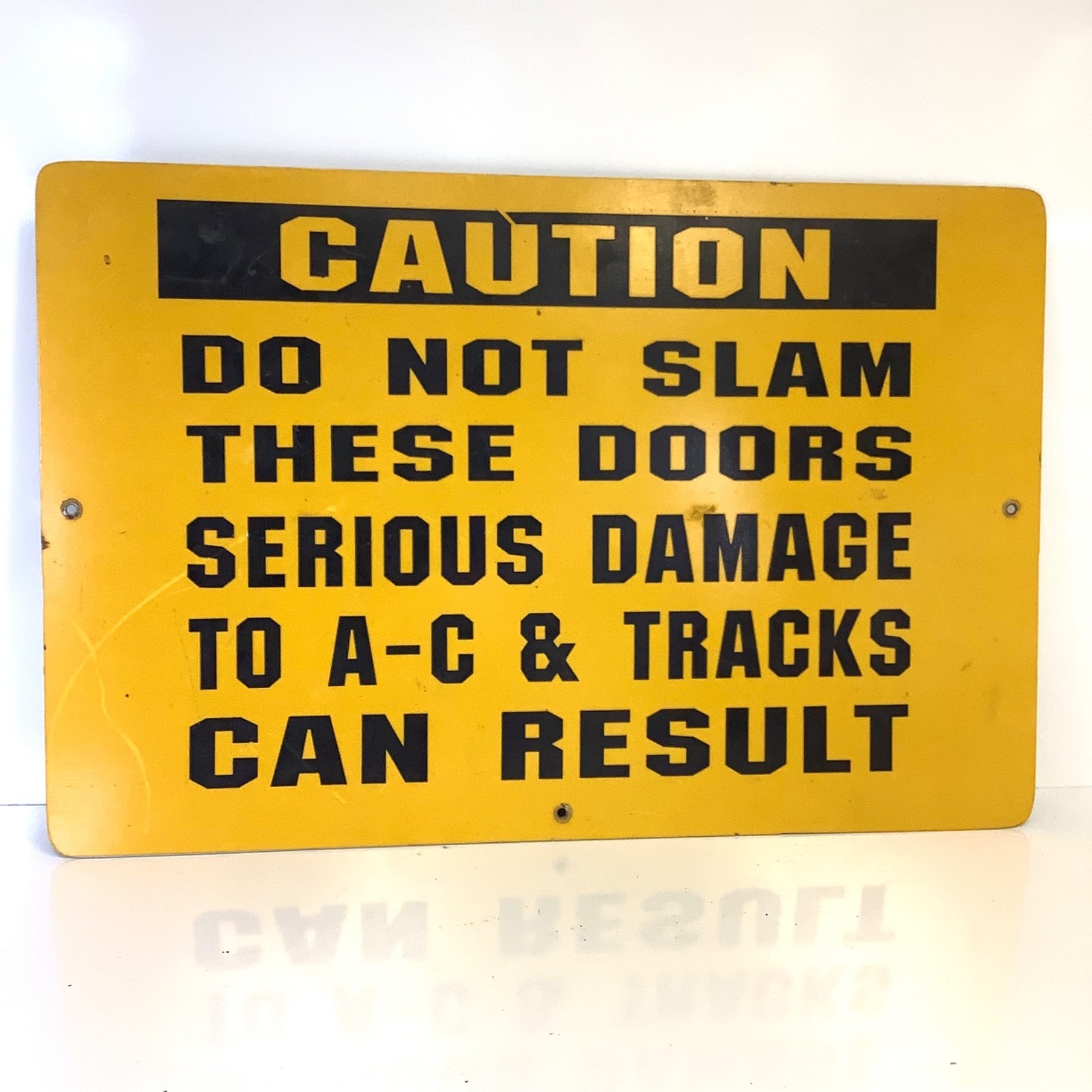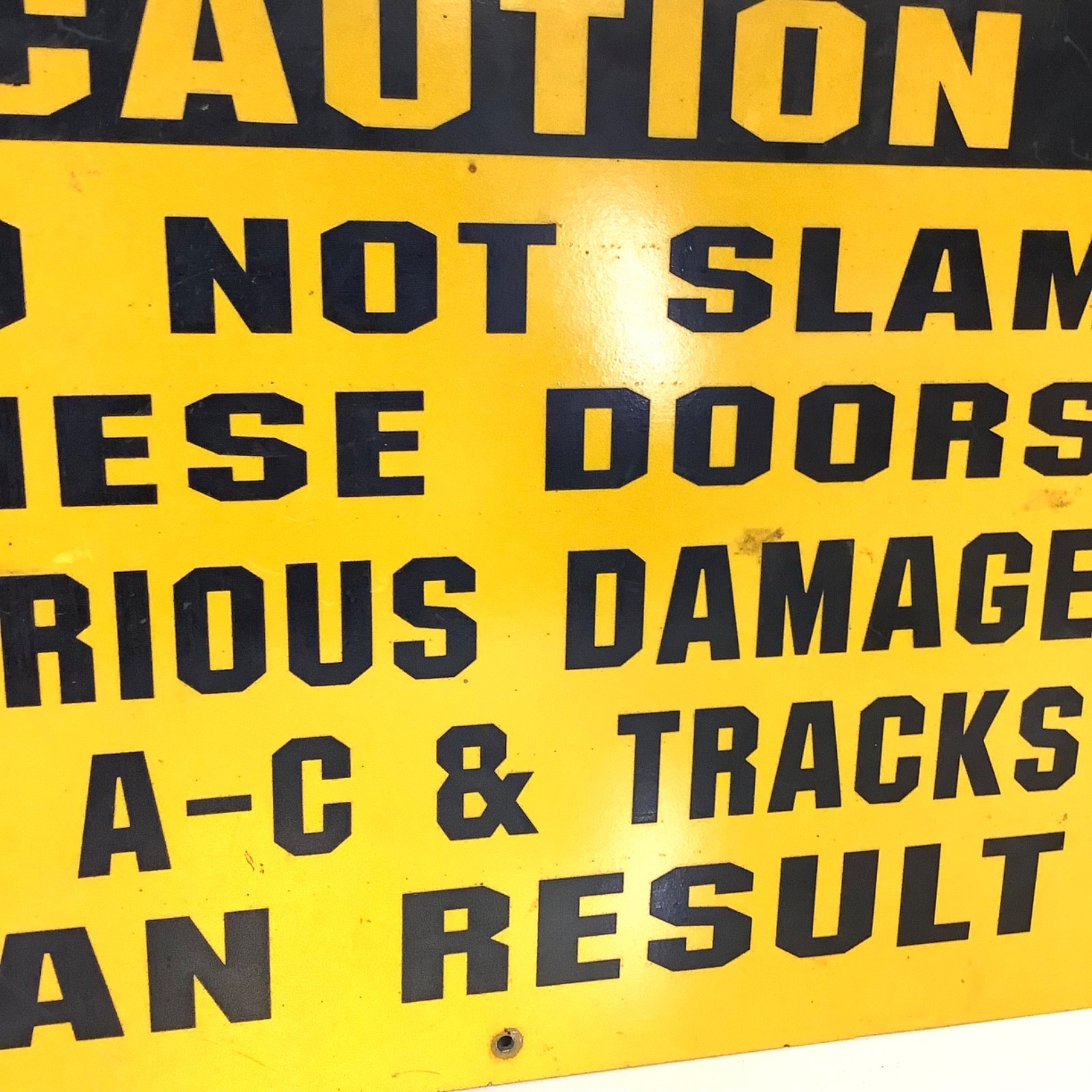 CAUTION Industrial Metal Do Not Slam Doors Warning Sign High Visibility Yellow. Overall, good condition. Measures approximately 18 inches wide by 12 inches high. Please see all photos.