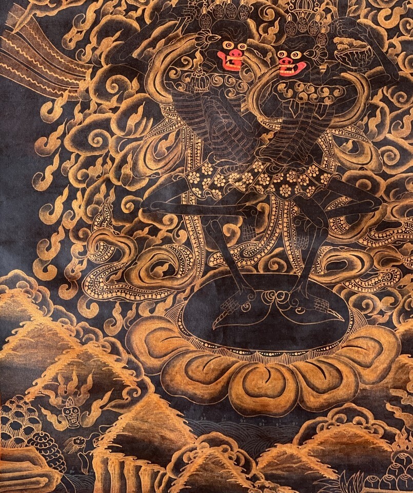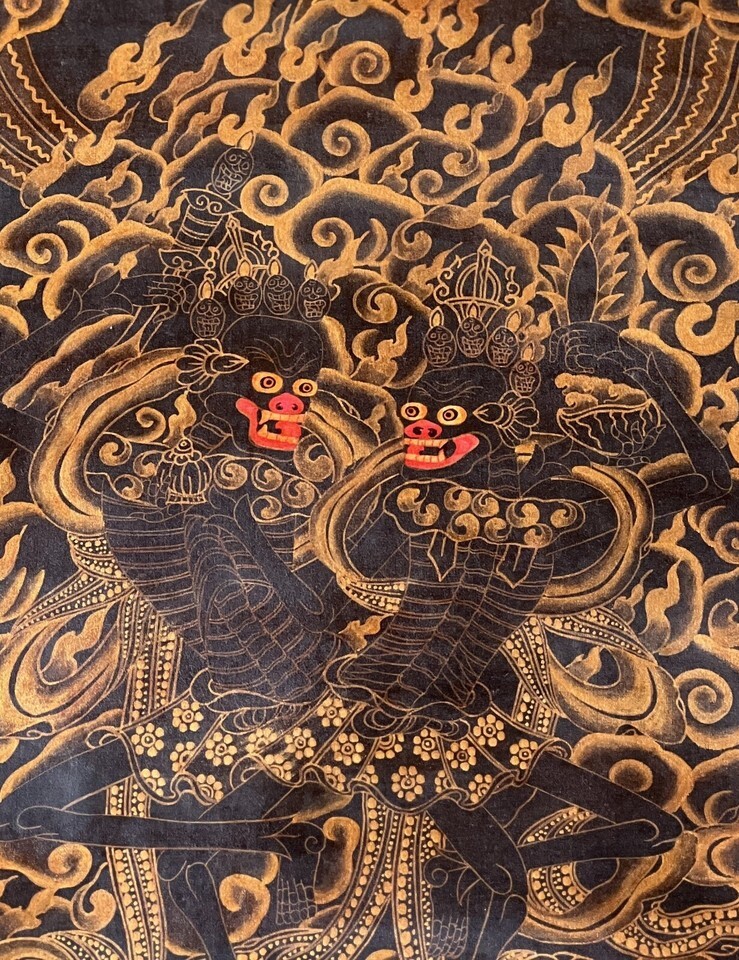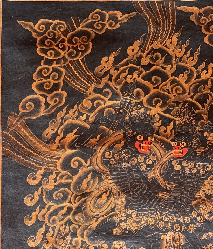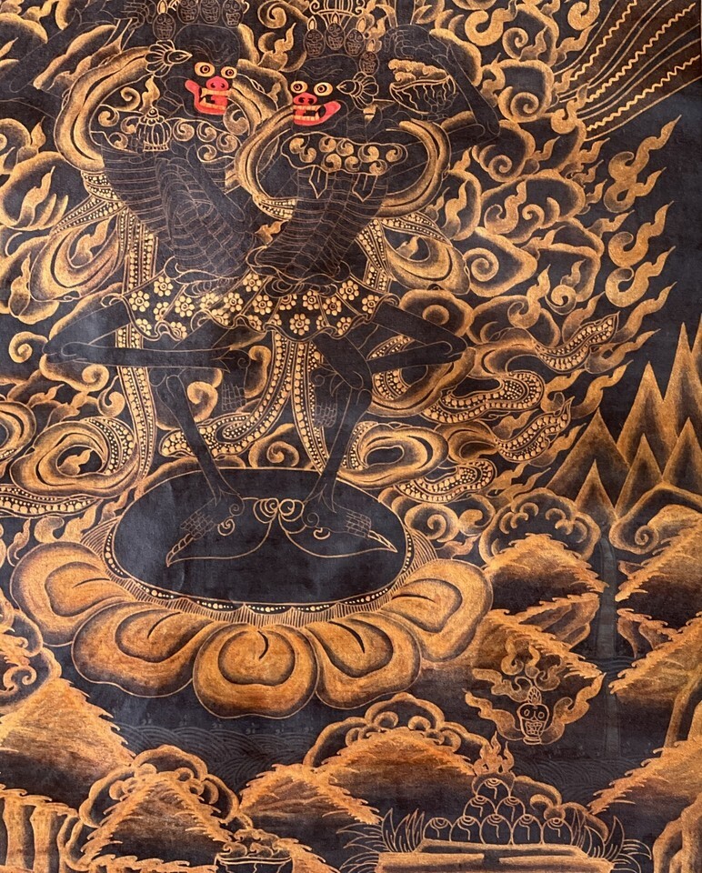 - CITIPATI/ DANCING SKELETON/ OIL-VARNISHED TIBETAN THANGKA PAINTING SILK FRAMED