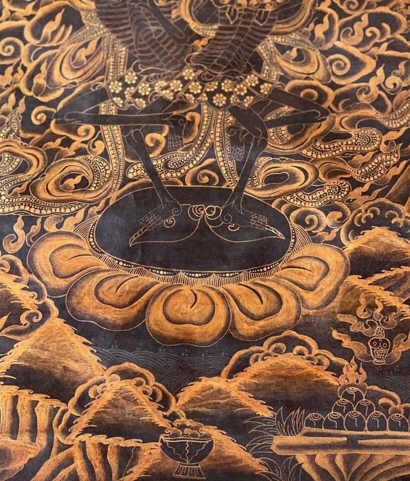 Citipati's representation transcends the foreboding nature of the charnel grounds, signifying a deeper contemplation on the impermanence of existence. This depiction serves as a unique and profound reminder of the Buddhist principle of impermanence, offering a rare window into the profound spiritual practices and cultural celebrations, making it a fascinating addition for enthusiasts and collectors alike.