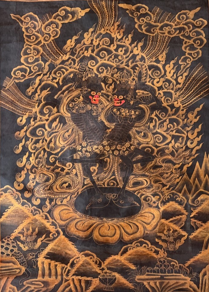 This is a truly unique hand-painted Tibetan Thangka Painting of a Citipati or Dancing Skeleton, a large-sized original artwork. The Citipati, known as the "Lord and Lady of the Charnel Grounds," are the primary Dharma protectors associated with the Vajrayogini tantric systems. The figures hold a rich history rooted in the meditation practices of Indian Mahasiddhas on charnel grounds. These practices were closely linked to the Heruka Chakrasamvara/Yogini transmission lineage, which was performed in areas covered with human remains where corpses were either cremated or left to be consumed by wild animals like vultures. This was a stark but poignant symbol of impermanence.