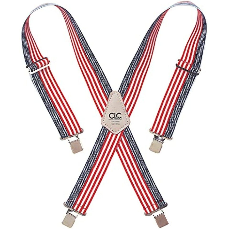 Product Description CLC 110USA heavy duty work suspenders, USA flag print. These patriotic design, heavy-duty work suspenders are fully adjustable and have full elastic straps for extra comfort. From the Manufacturer The 110USA, Heavy Duty USA Flag Elastic Suspenders from Custom LeatherCraft are nylon stitched for durability with heavy duty front and back clips. 2¿ wide elastic heavy duty straps for comfort adjust to fill all sizes.