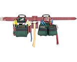 7 main reversed nail and tool pockets and 8 smaller pockets fit pliers, nail sets, pencils, knife, etc. Leather combination square and pry bar holders. Fits waist sizes 29" - 42".