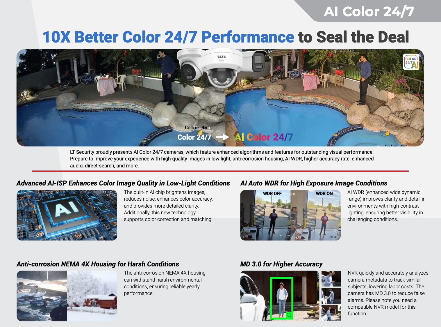LTS products provide 24/7 vivid colorful images with F1.0 advanced lenses, high-performance sensors, and friendly lighting. F1.0 super-aperture collects more light to produce brighter images in dark environments. Advanced sensor technology can vastly improve the utilization of available light.