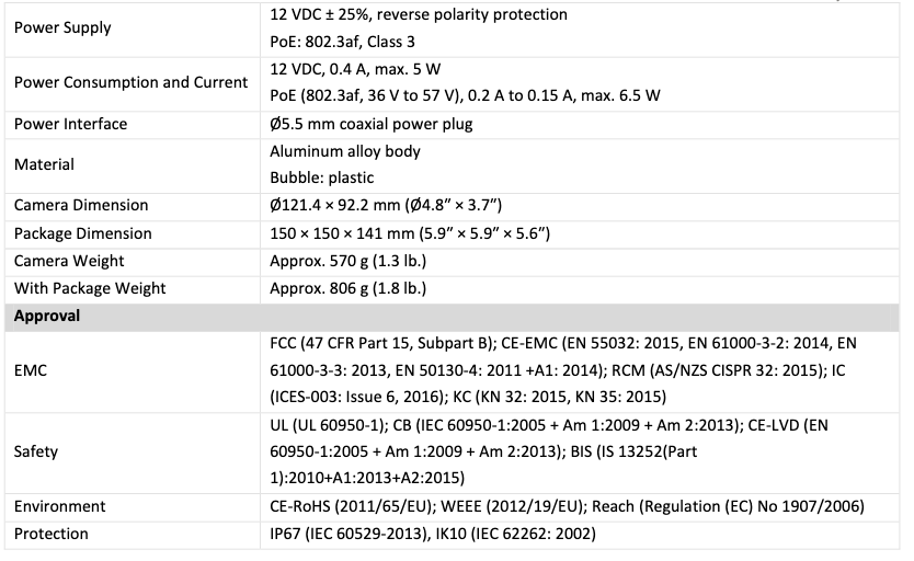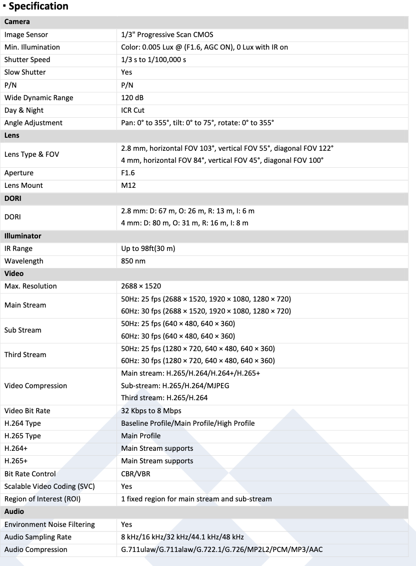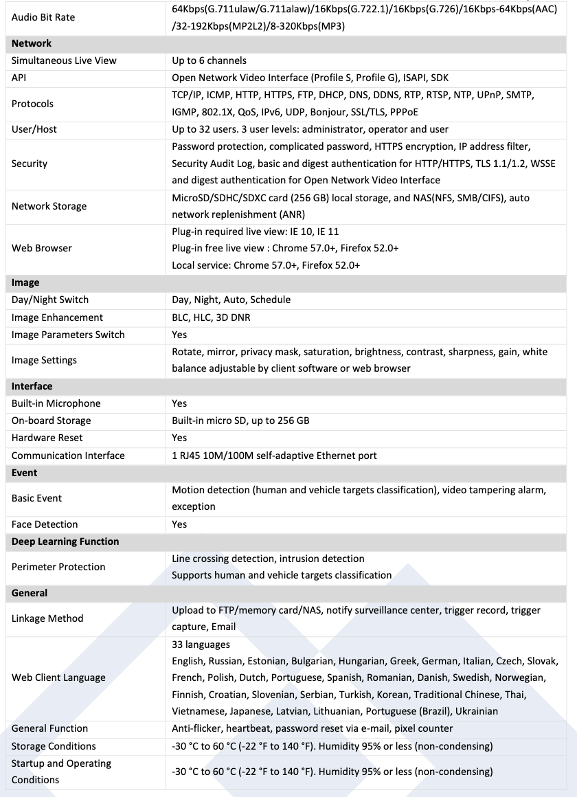 High quality imaging with 4 MP resolution, Clear imaging against strong backlight due to 120 dB WDR technology, Efficient H.265+ compression technology, Built-in microphone for real-time audio security, Water and dust resistant (IP67) and vandal resistant (IK10), Focus on human and vehicle targets classification based on deep learning