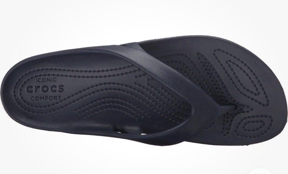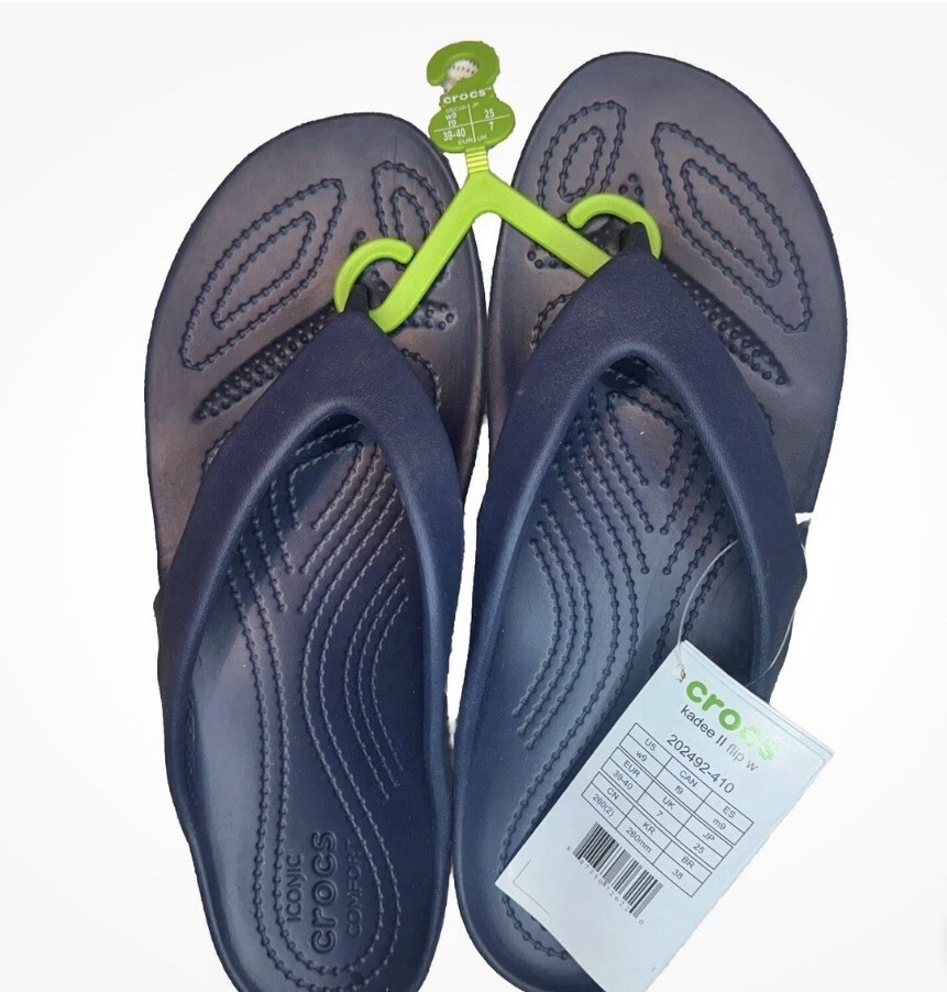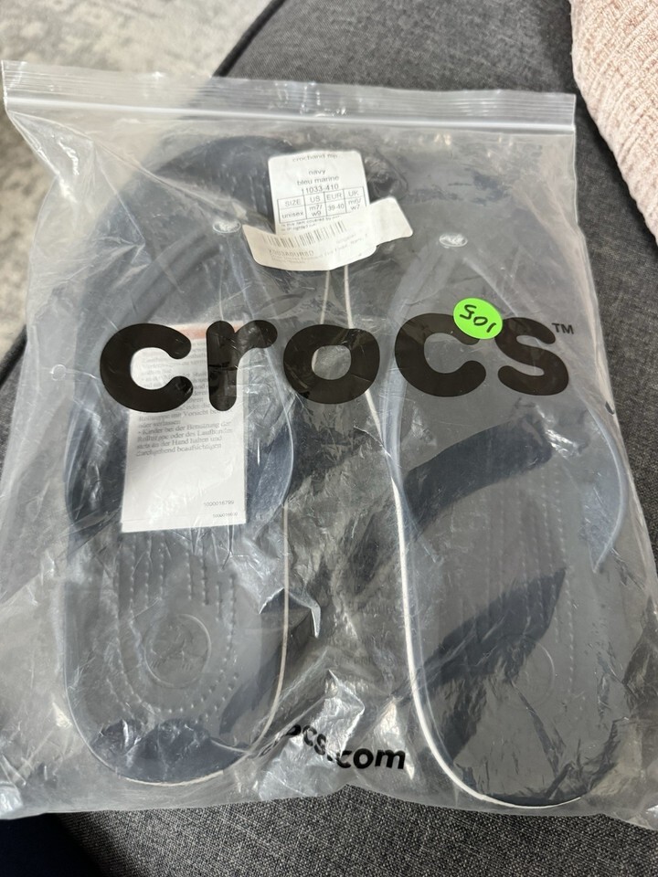 The product is a pair of women's navy blue Crocs in size 9, featuring a round toe shape, slip-on closure, and flat heel. These clogs are designed for casual occasions with a comfortable rubber outsole and synthetic lining. The Crocs brand logo accents the classic solid blue color, making them perfect for summer, fall, and spring seasons. With a low top shoe shaft style and standard shoe width, these Crocs are ideal for walking and everyday wear.