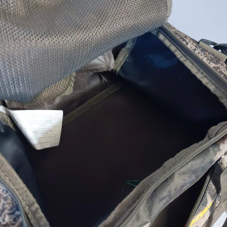 The Cabela's Camouflage Carryall Soft Utility Tote is a small duffle bag with a shoulder strap, perfect for hunting trips in the fall season. It features a zip closure, six pockets, and a lightweight, collapsible design. The nylon-web padded straps ensure comfortable carrying, while the water-resistant material protects your gear from the elements. This versatile shoulder bag from Cabela's is a must-have for any outdoor enthusiast looking for a durable and practical hunting accessory. Good condition with normal wear.