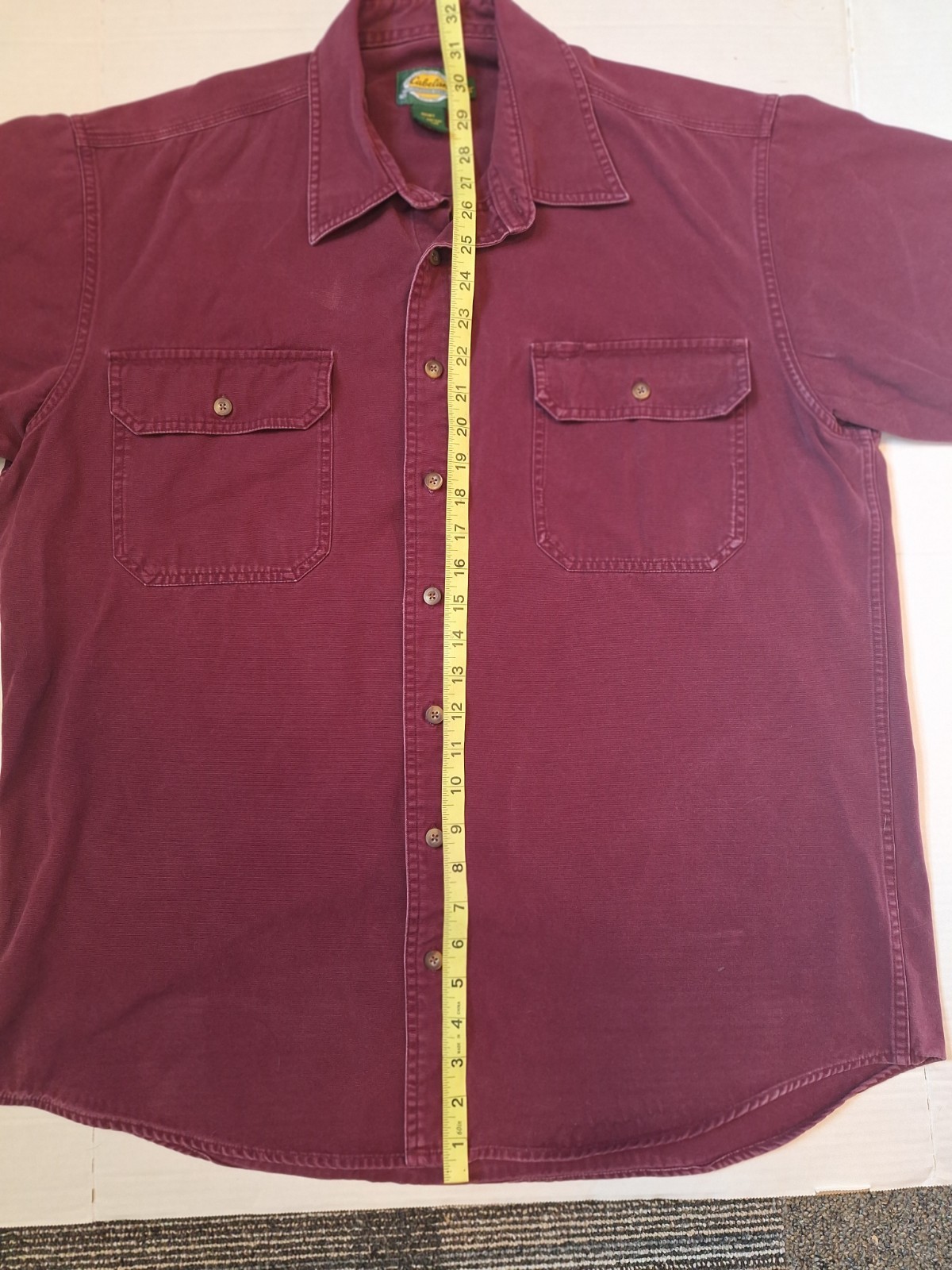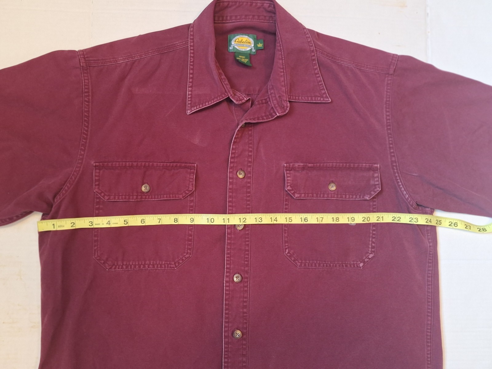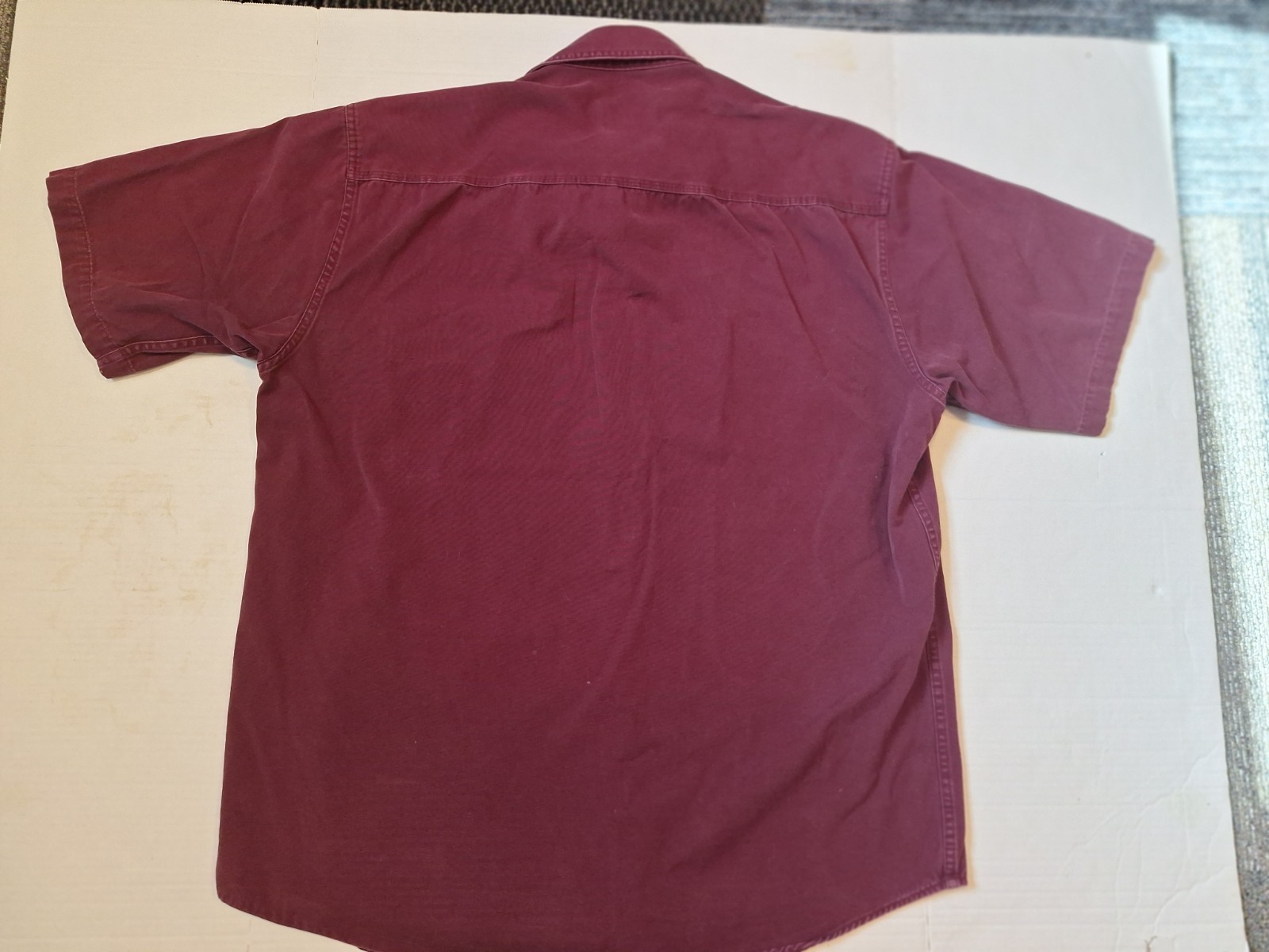 The Cabela's Short Sleeve Shirt for men is a stylish and comfortable addition to any casual wardrobe. Made from 100% cotton, this dark red shirt features a solid pattern with short sleeves and a collared neckline. Ideal for outdoor activities, this button-down shirt also includes convenient pockets for added functionality. With a tall fit and size LT, this shirt is perfect for men looking for a quality and durable piece of clothing. Small spot on back. See last picture
