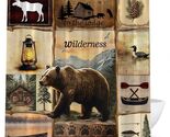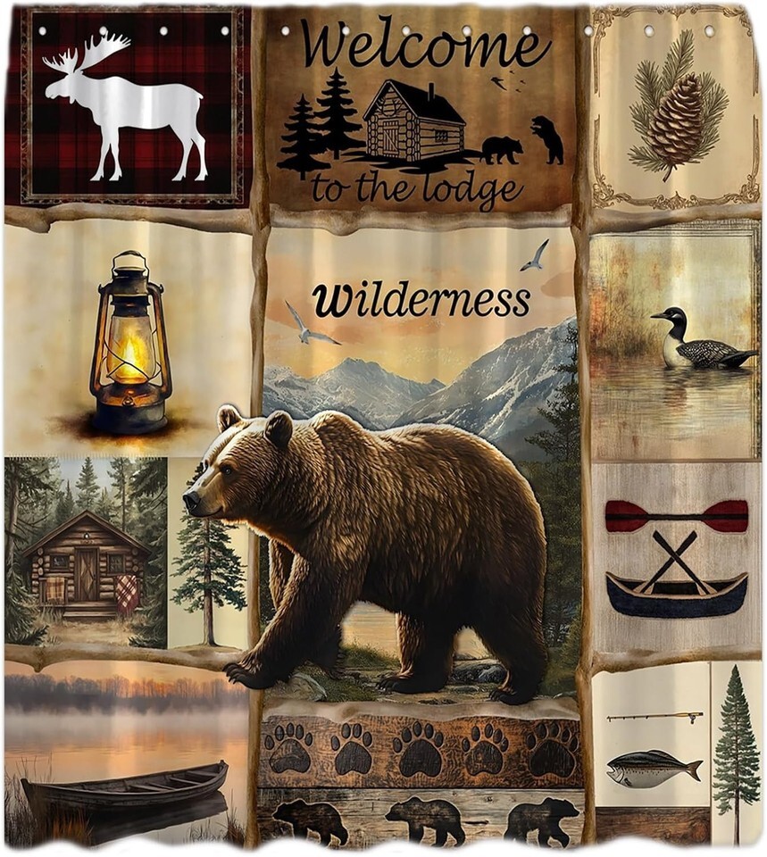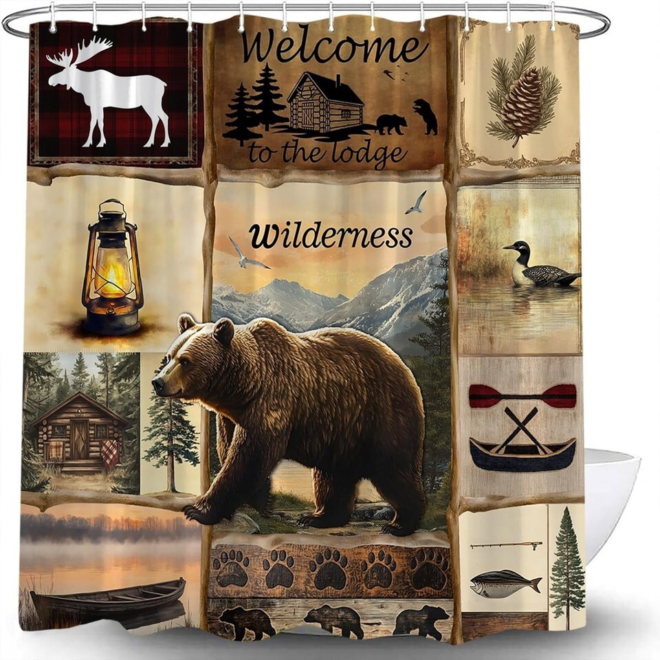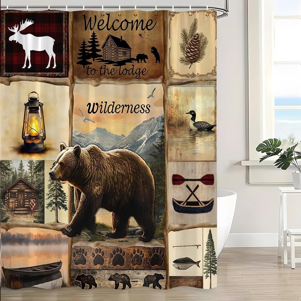 - Cabin Lodge Bear Timber Wildlife Fabric Shower Curtain, Modern Rustic, 70"x70"